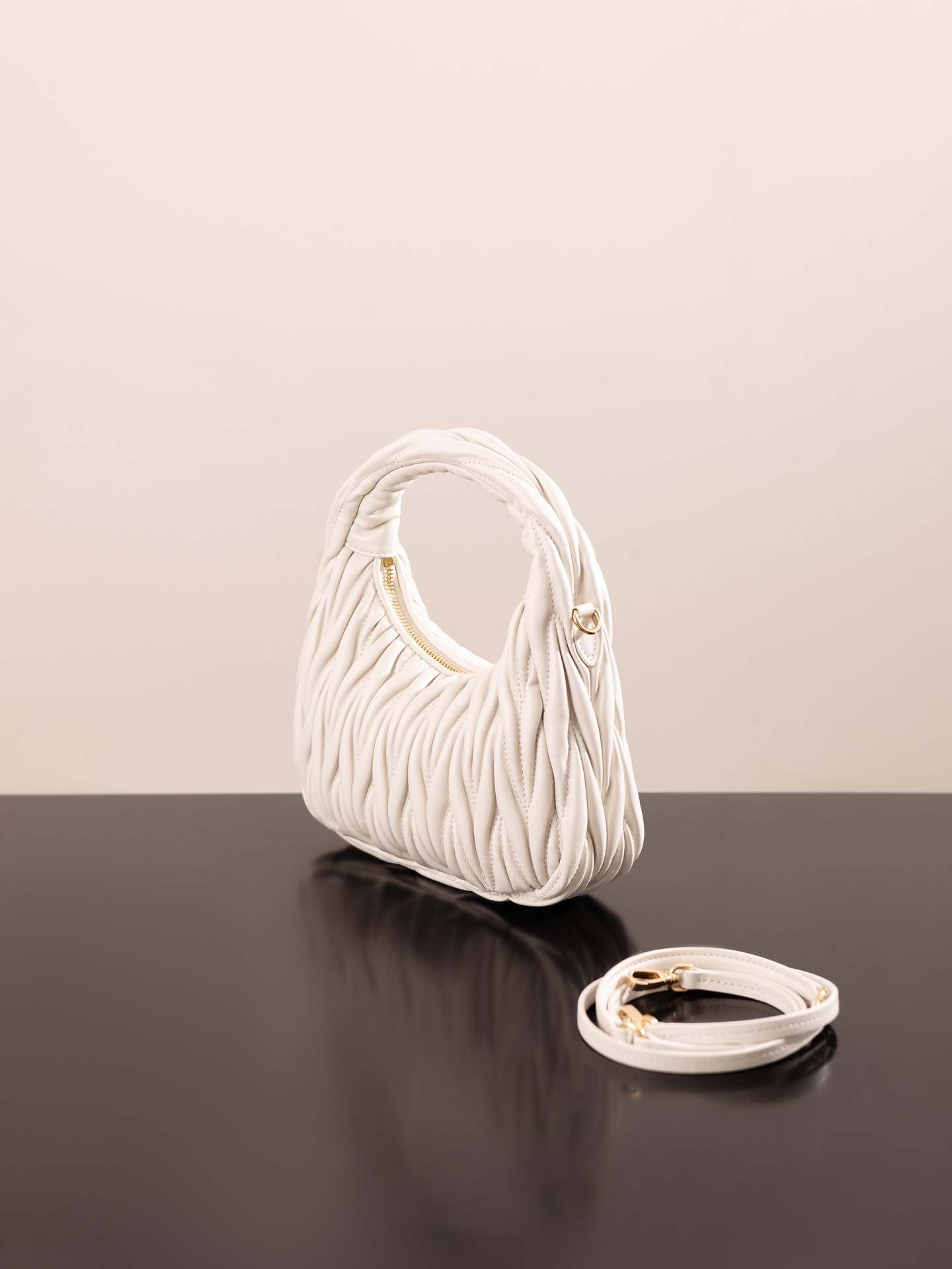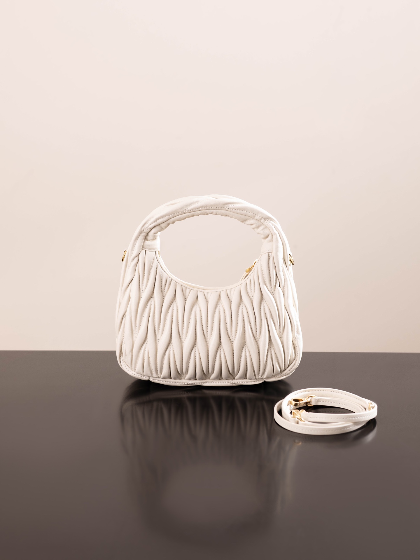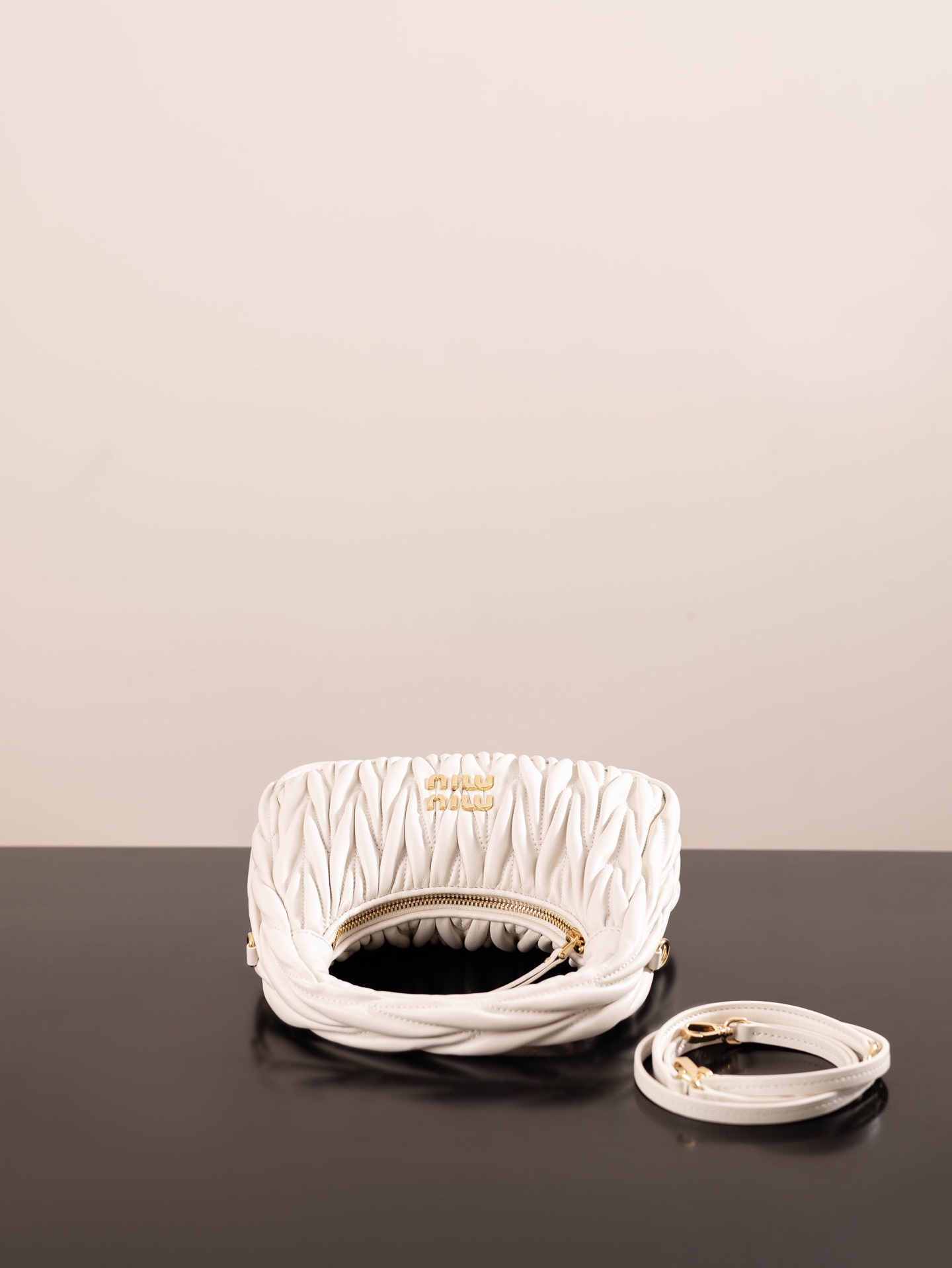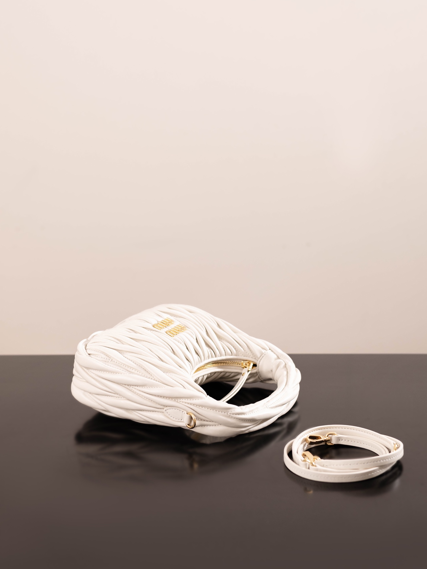 미우미우의 완더 호보 소형 백은 정교한 공예로 입체적인 효과를 자랑합니다.