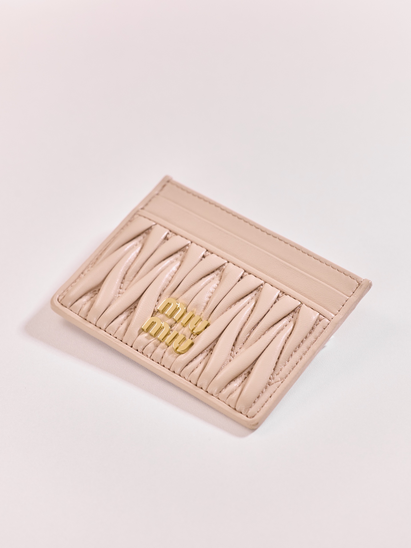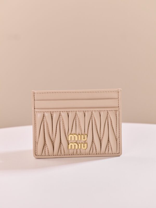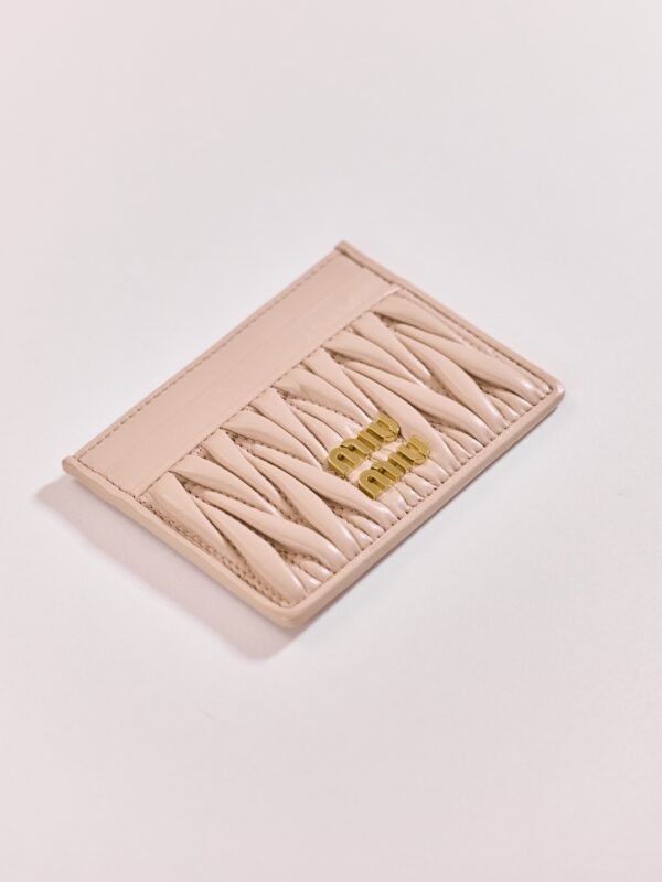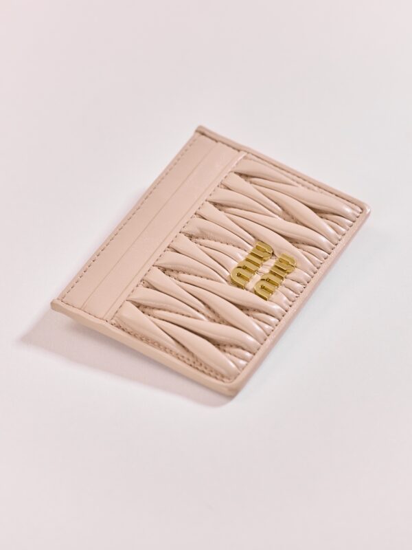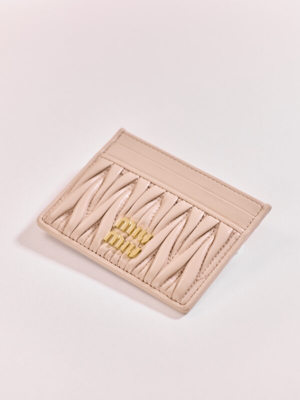 미우미우의 Matelassé 카드 지갑은 부드러운 양가죽으로 제작되어 고급스러운 느낌을 줍니다.