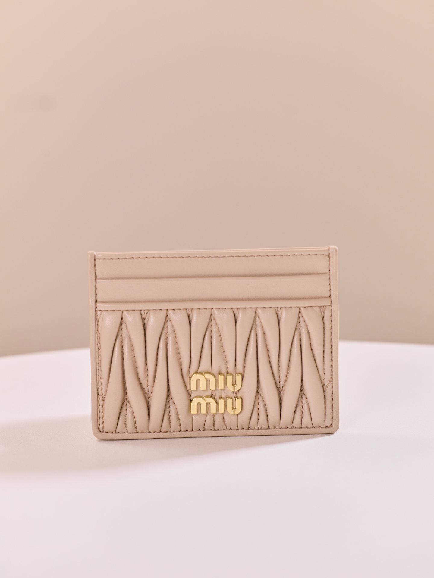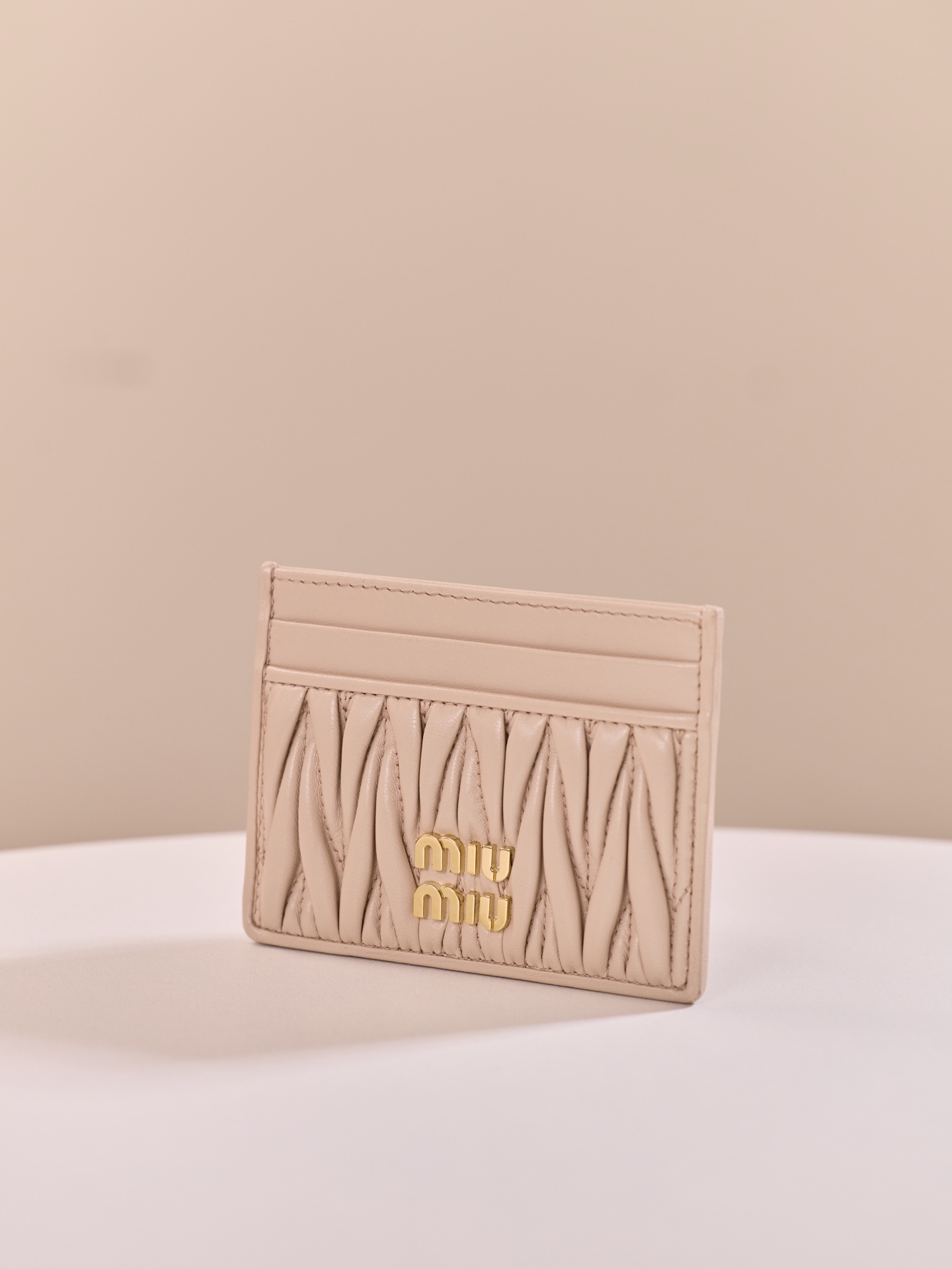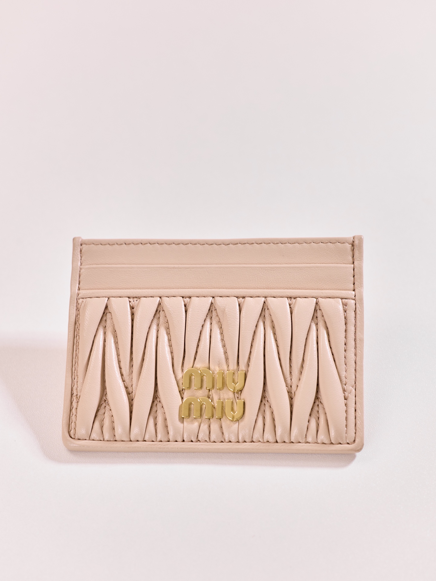 미우미우의 Matelassé 카드 지갑은 부드러운 양가죽으로 제작되어 고급스러운 느낌을 줍니다.