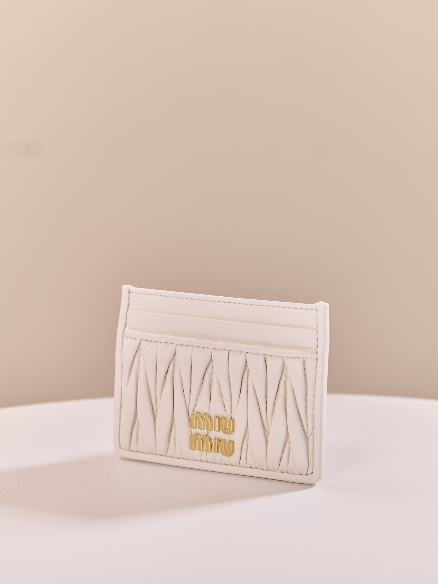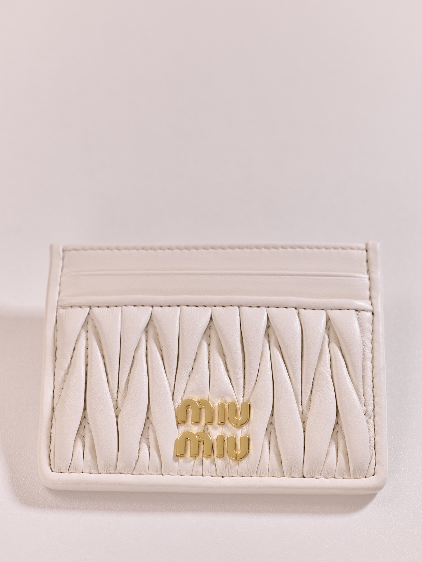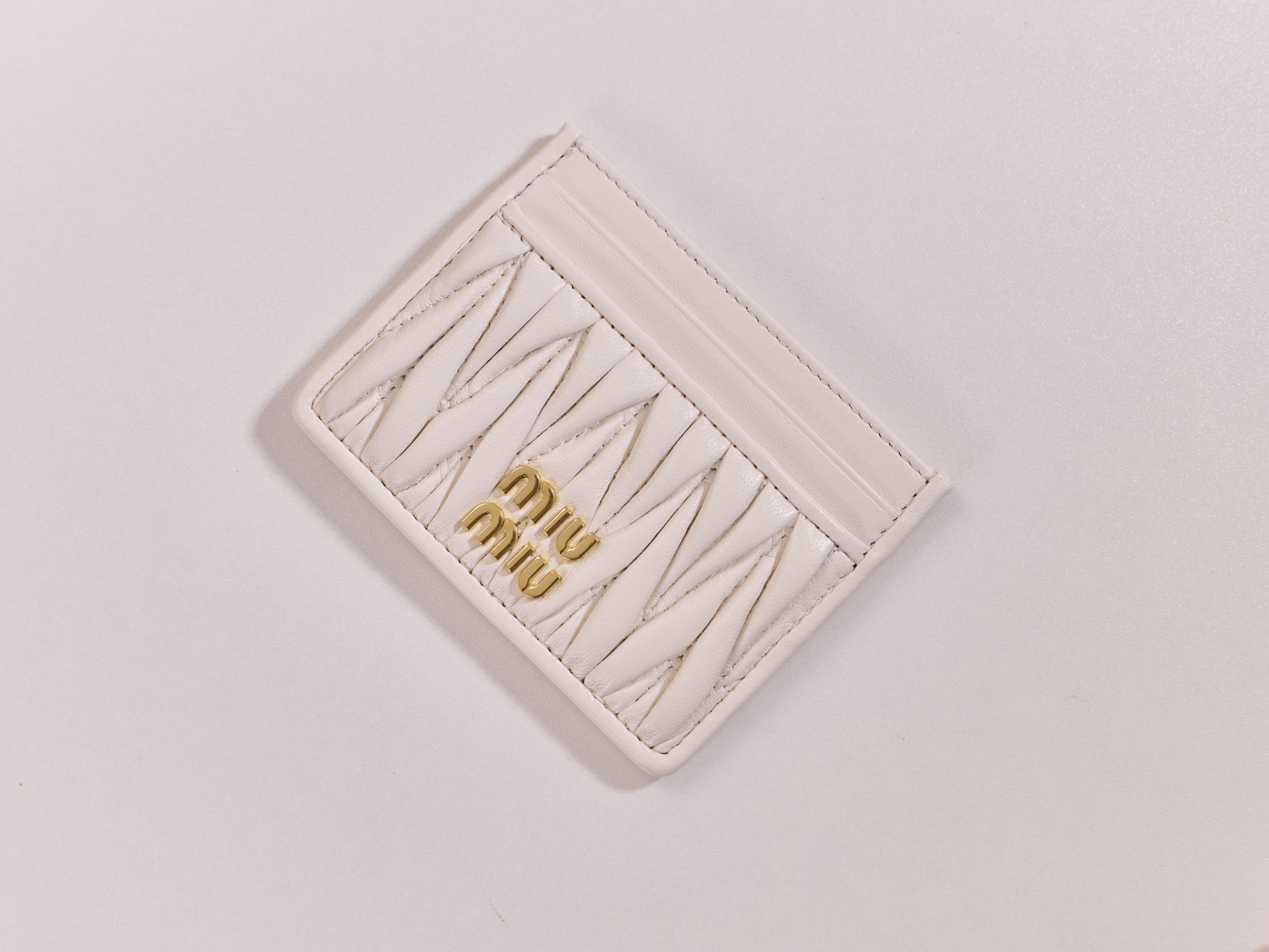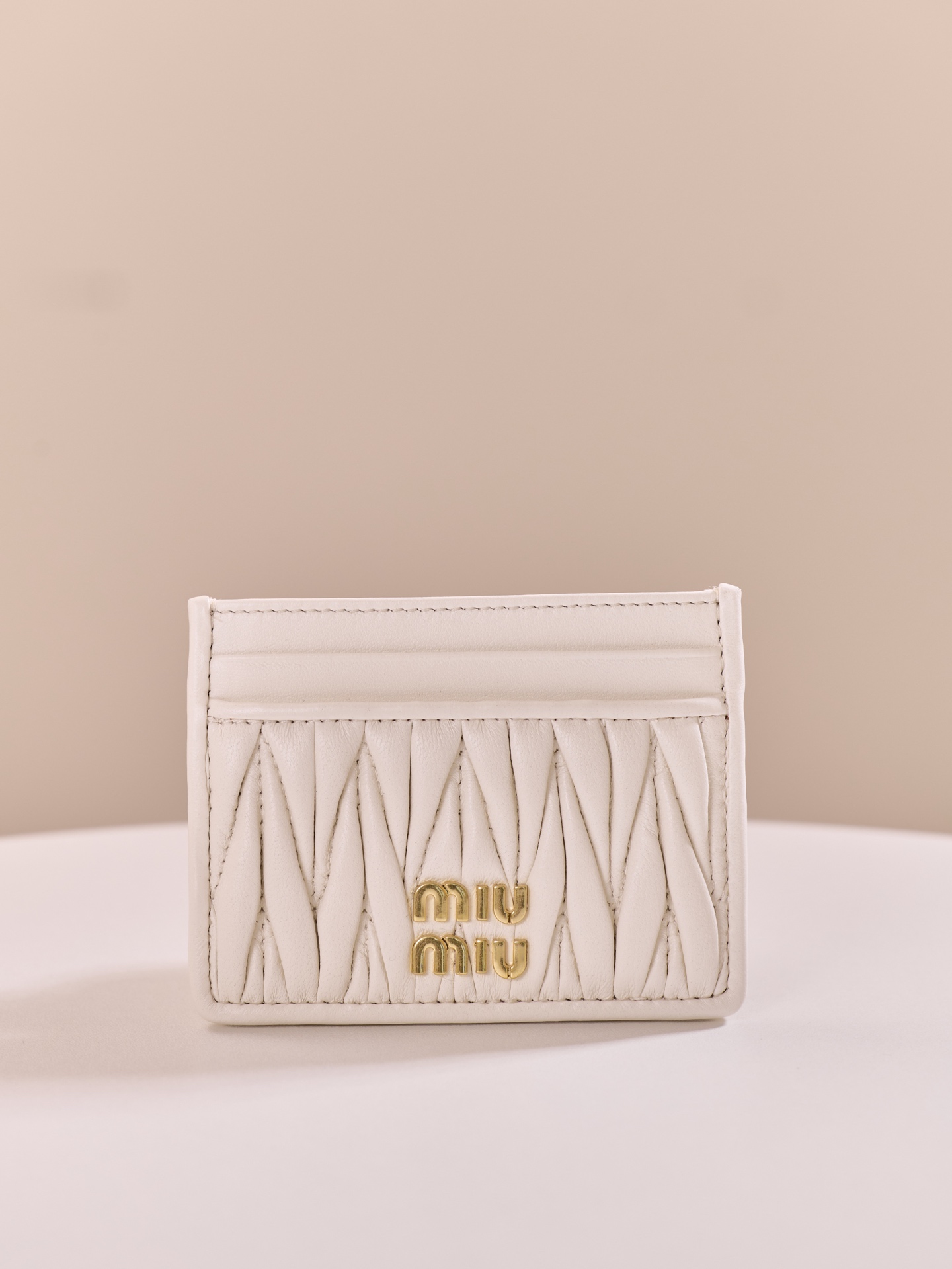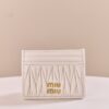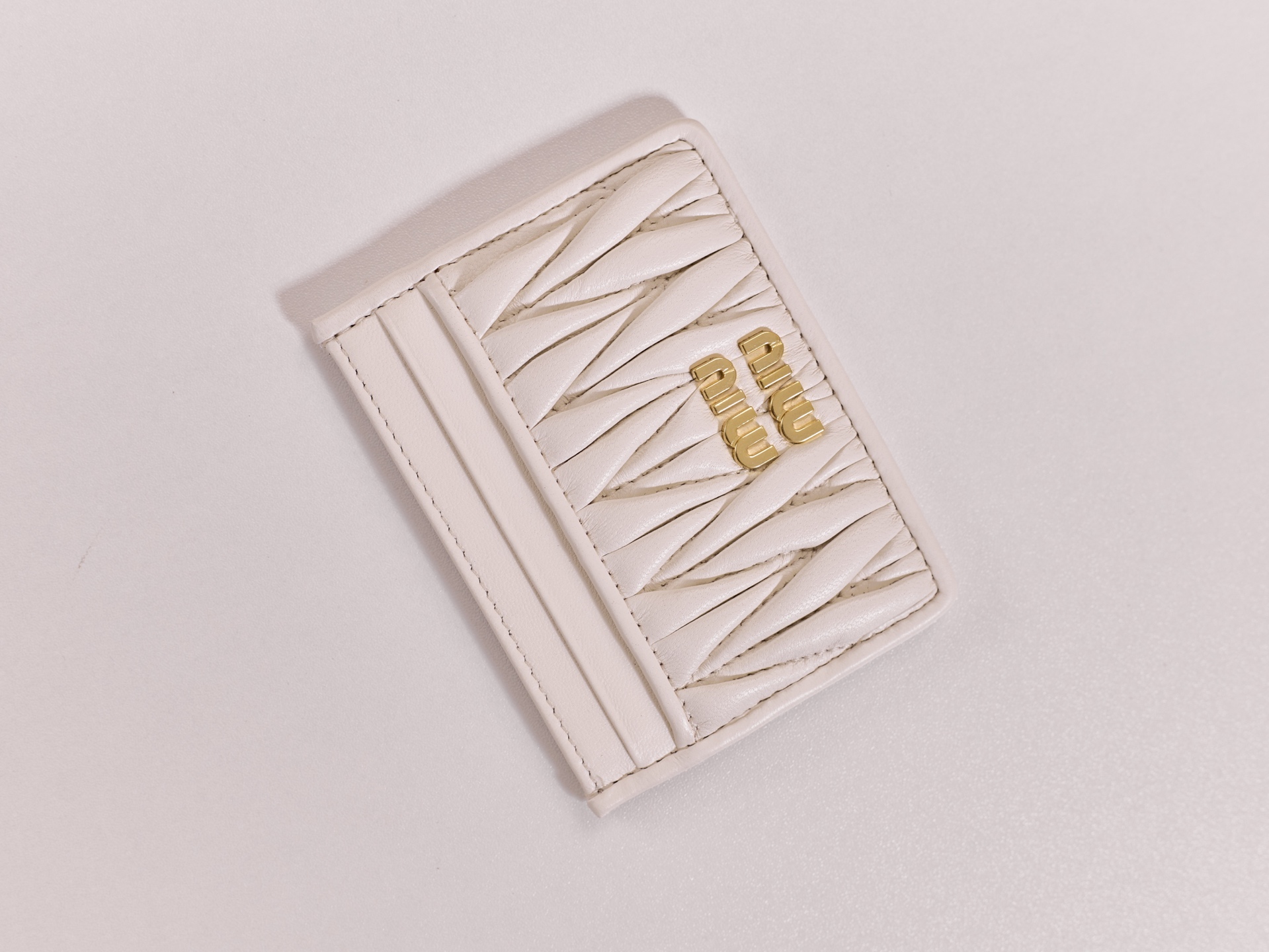 부드러운 양가죽 소재로 제작된 미우미우 카드 지갑입니다. 특유의 입체적인 마텔라세 패턴이 고급스러움을 더하며, 브랜드의 아이코닉한 디자인을 잘 보여줍니다.