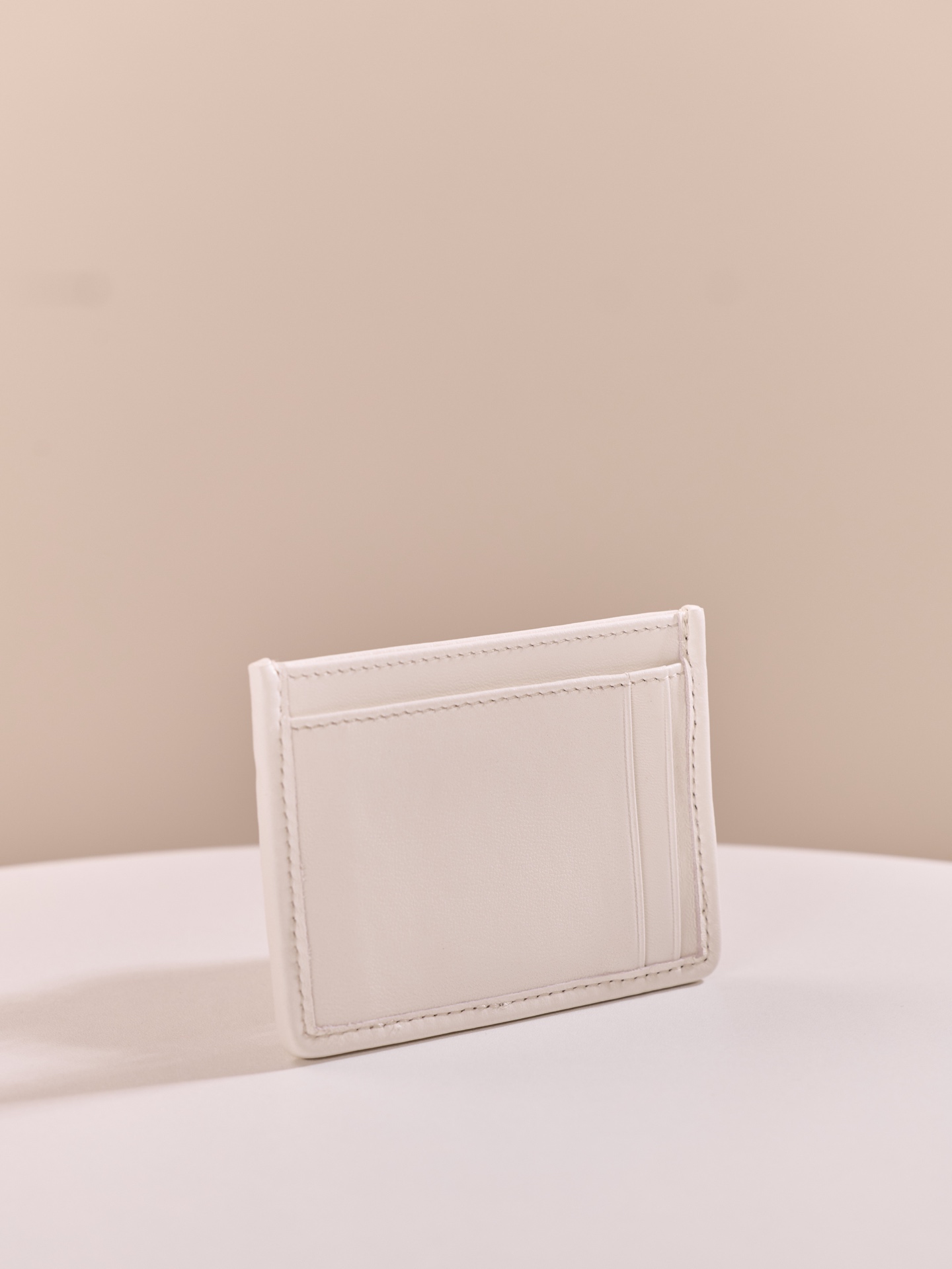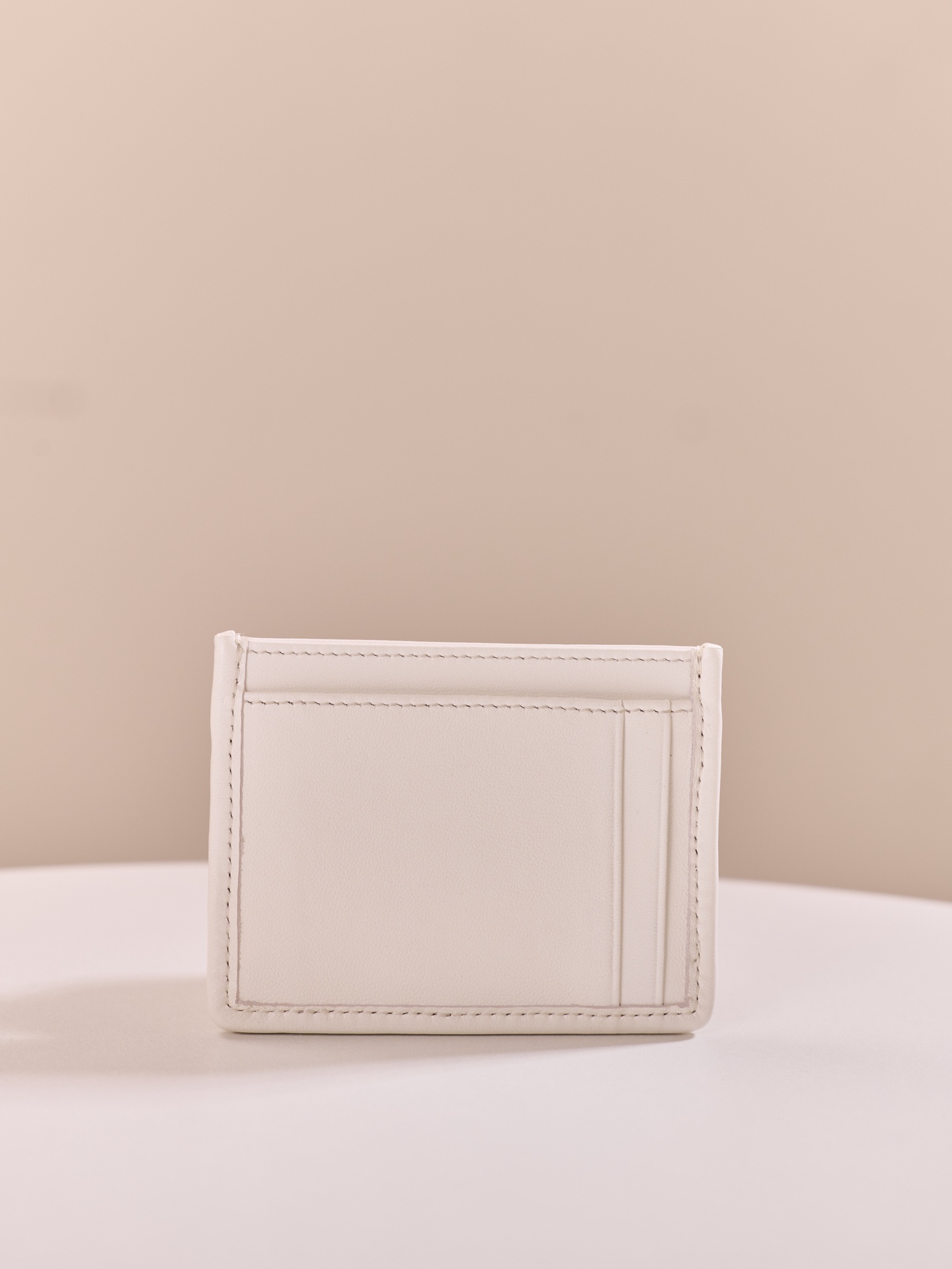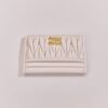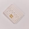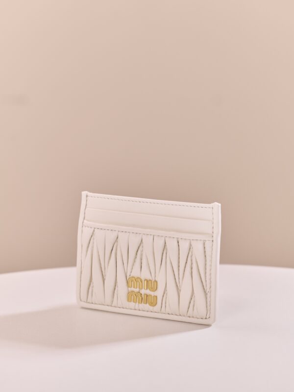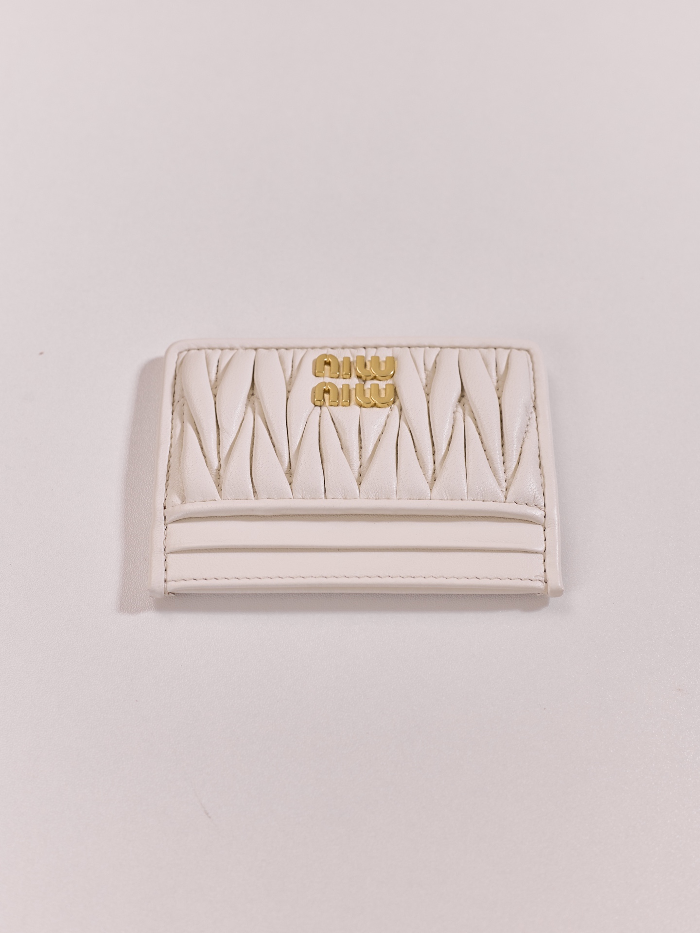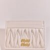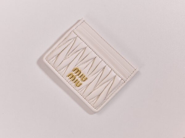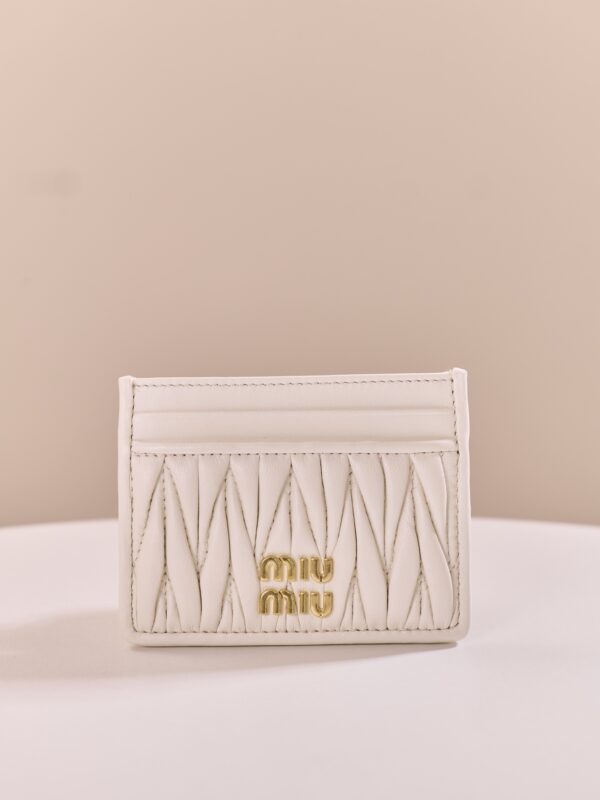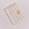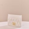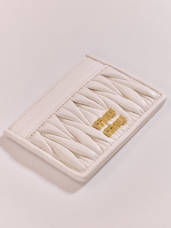 부드러운 양가죽 소재로 제작된 미우미우 카드 지갑입니다. 특유의 입체적인 마텔라세 패턴이 고급스러움을 더하며, 브랜드의 아이코닉한 디자인을 잘 보여줍니다.