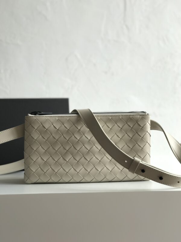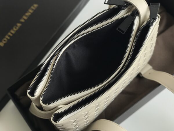 보테가 베네타의 클래식 편직 가죽 메신저백입니다. 고급스러운 매트한 질감의 인트레치아토 가죽이 사용되어 세련된 느낌을 줍니다.