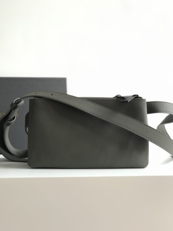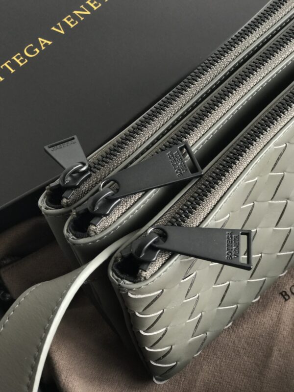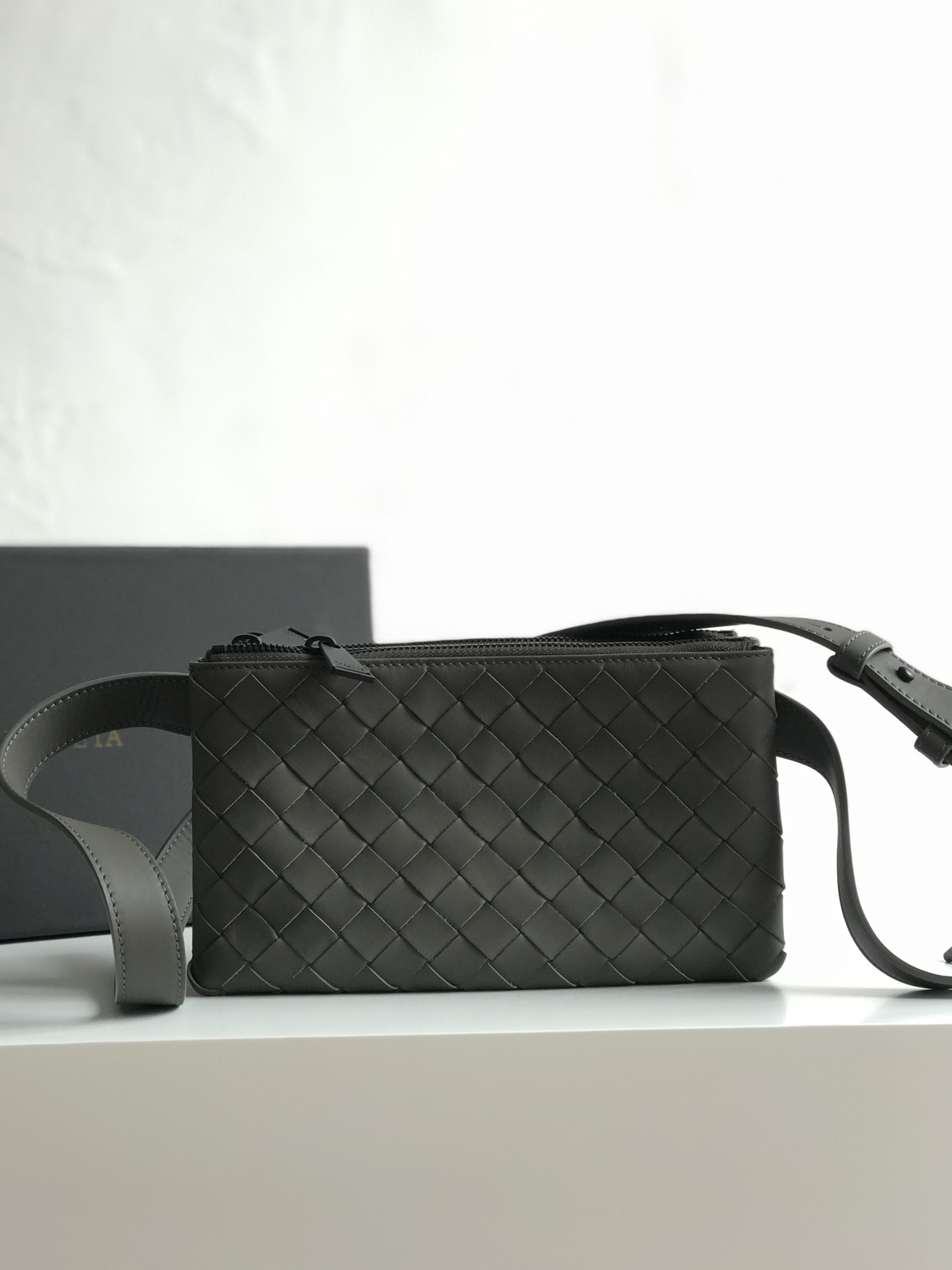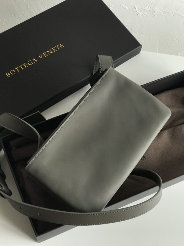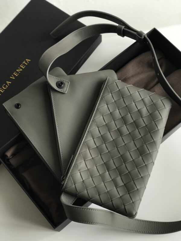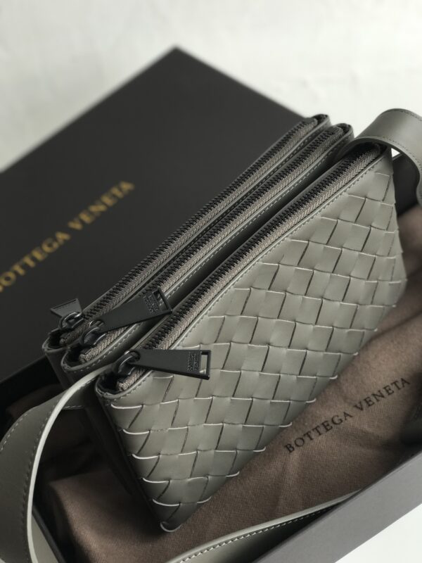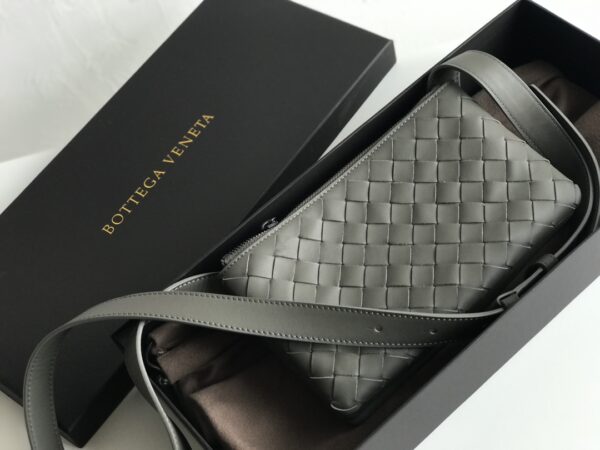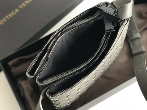 보테가 베네타의 클래식 편직 가죽 메신저백은 매트한 질감이 돋보이는 디자인입니다.
