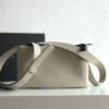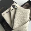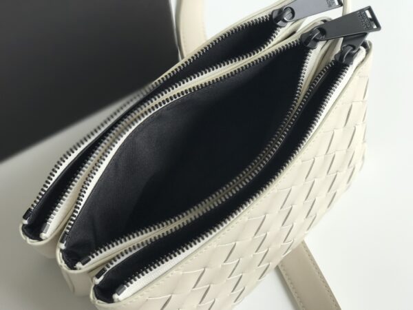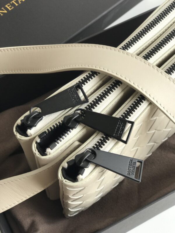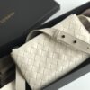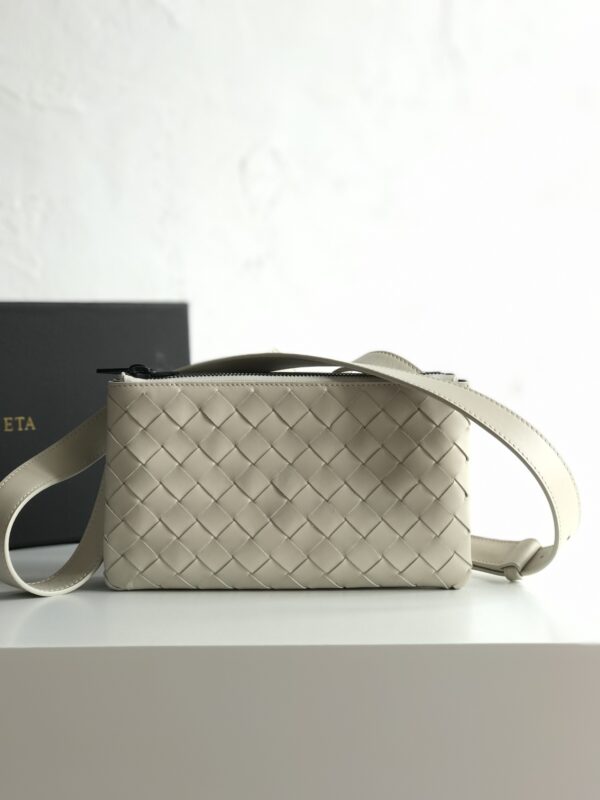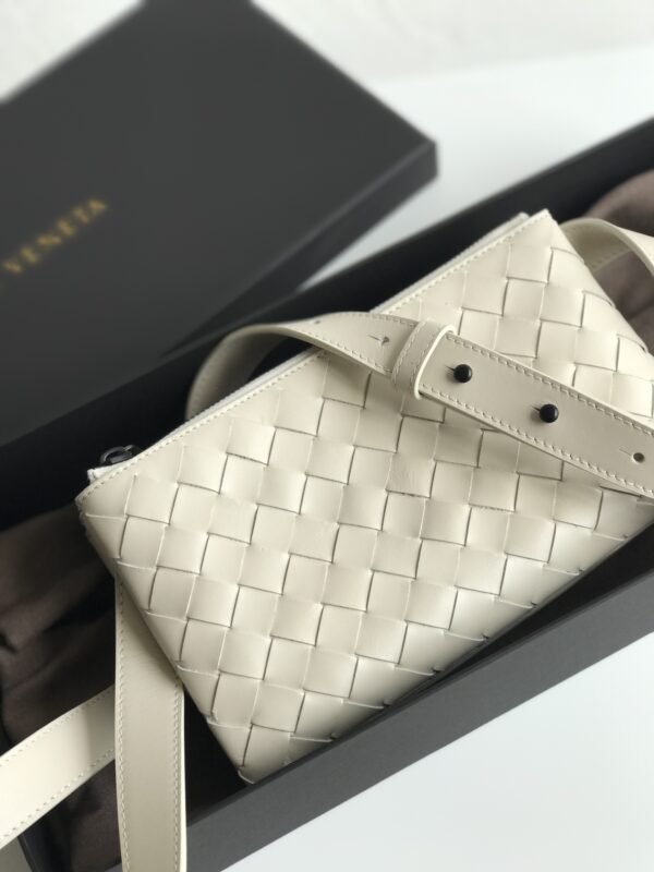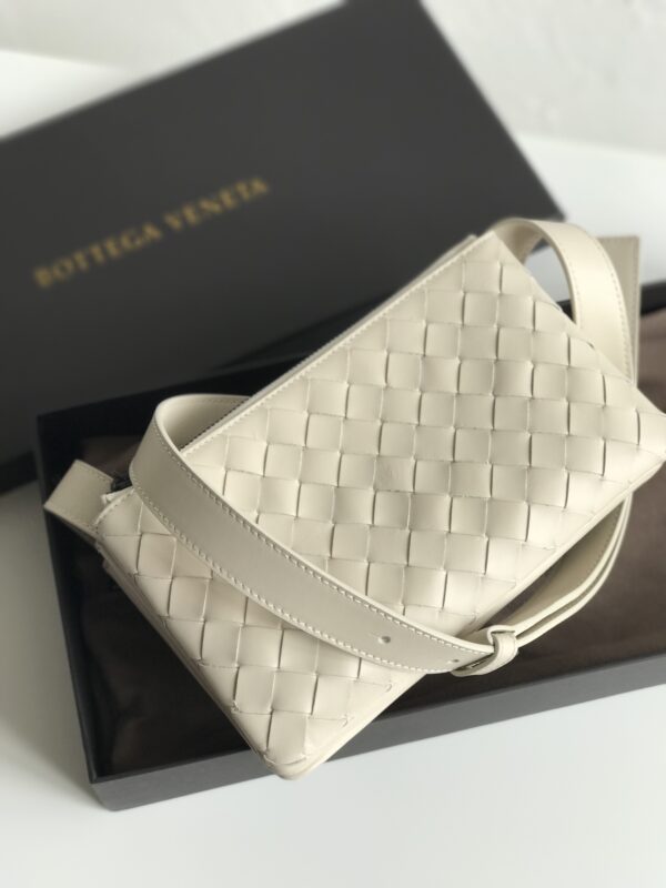 보테가 베네타의 클래식 편직 가죽 메신저백입니다. 부드러운 질감의 아이보리 색상으로, 고급스러운 매력을 더해줍니다.
