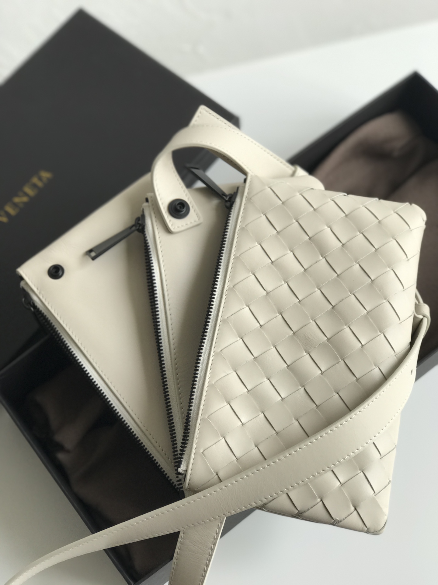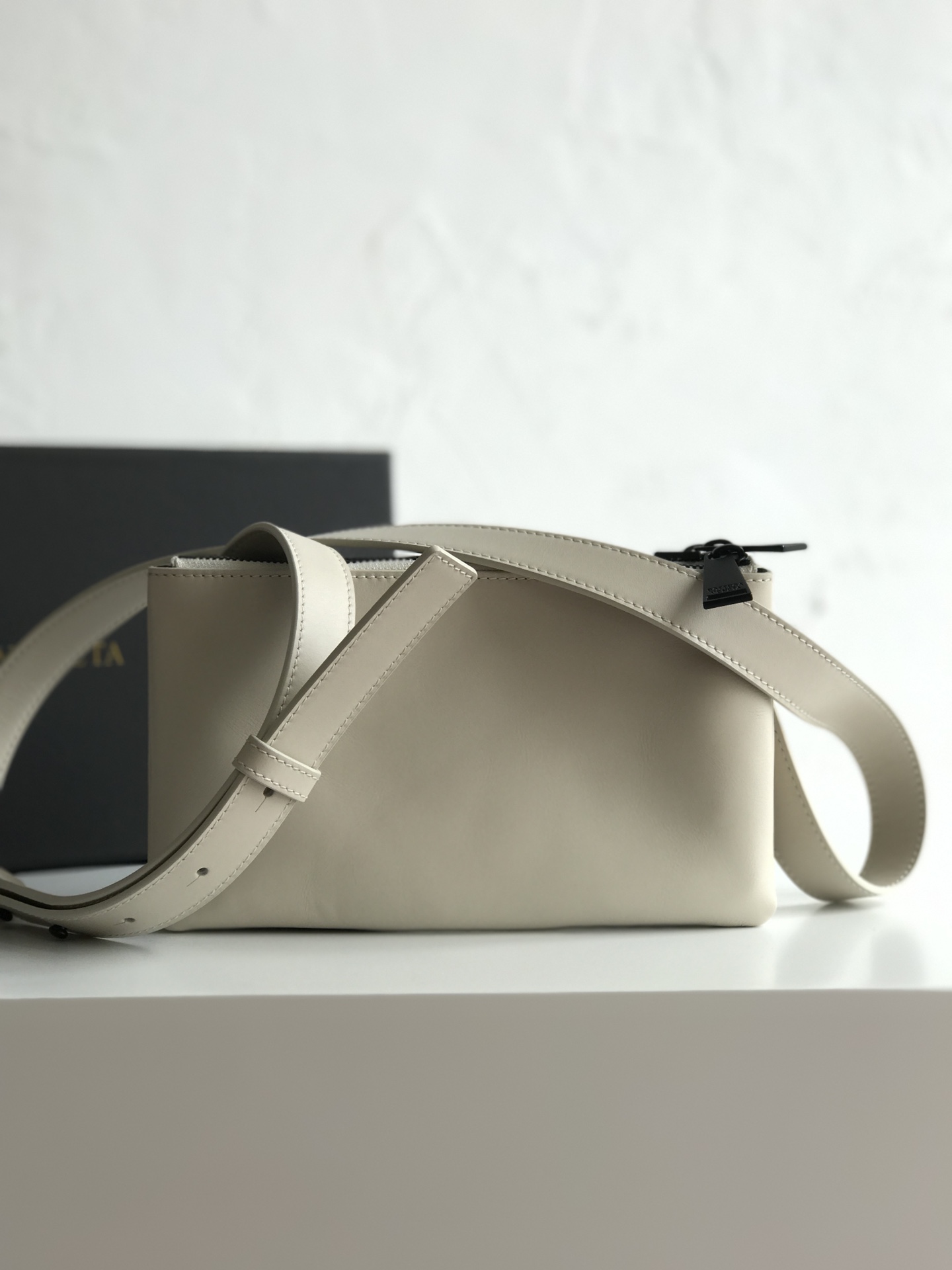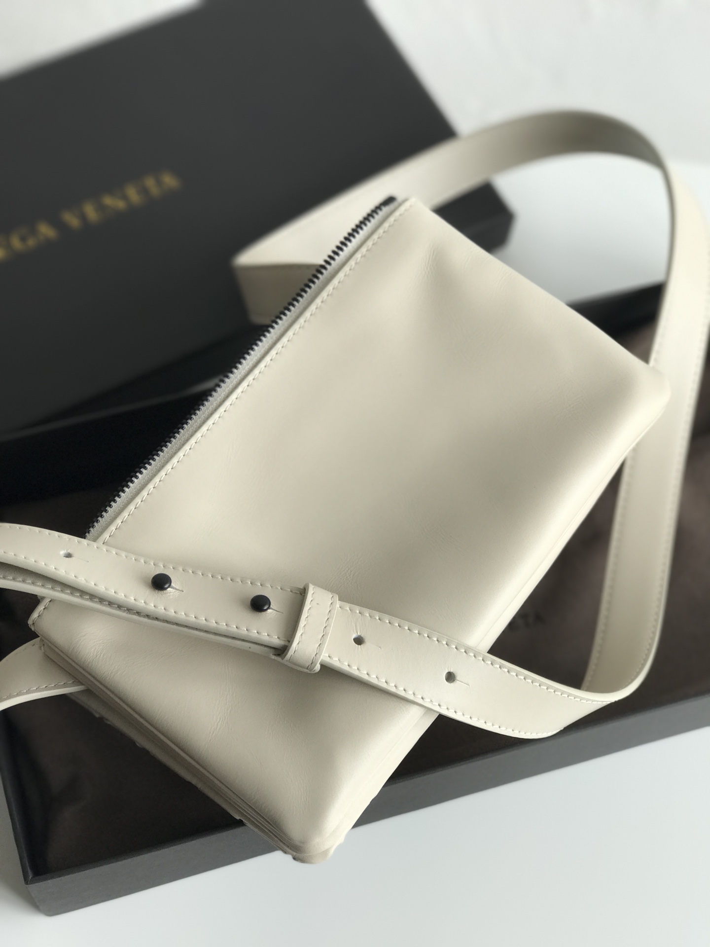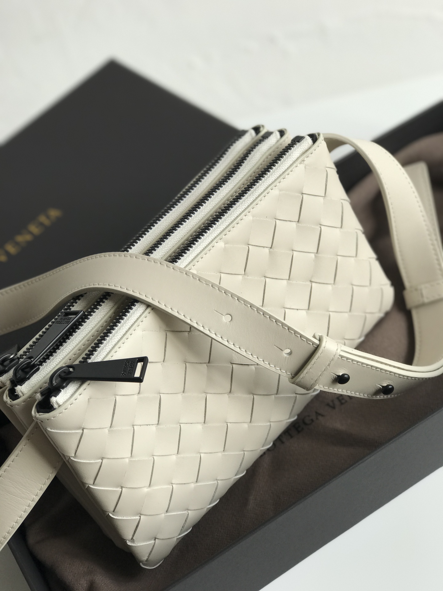 보테가 베네타의 클래식 편직 가죽 메신저백입니다. 부드러운 질감의 아이보리 색상으로, 고급스러운 매력을 더해줍니다.