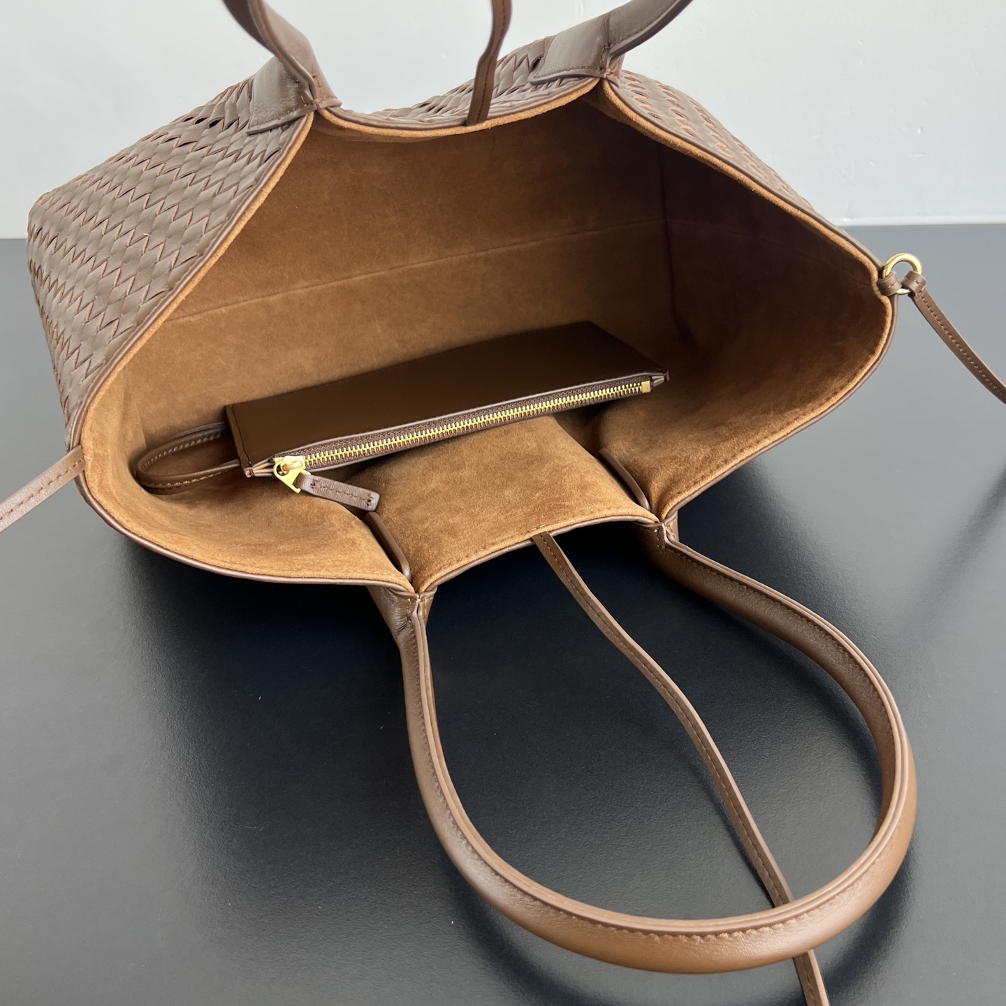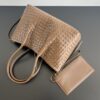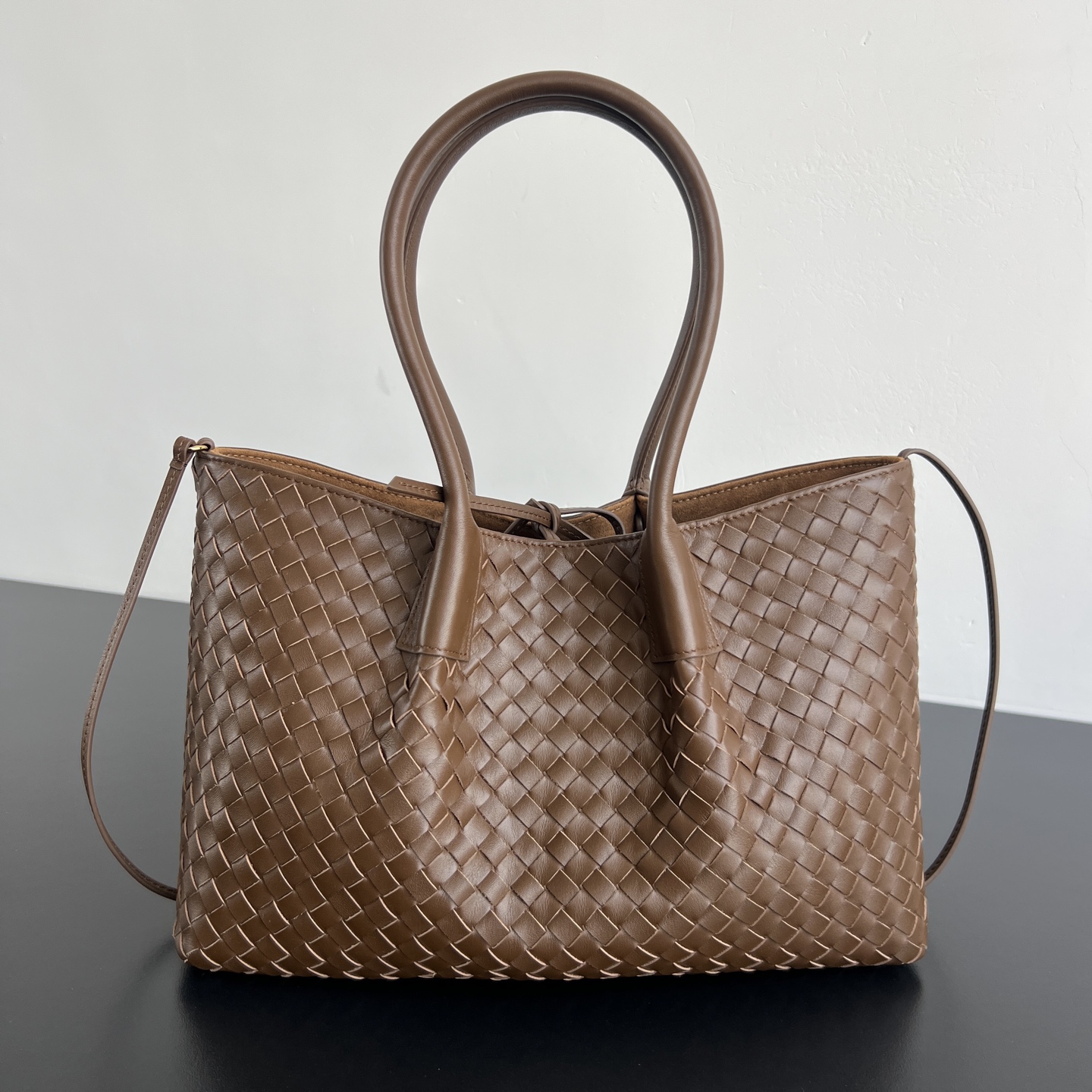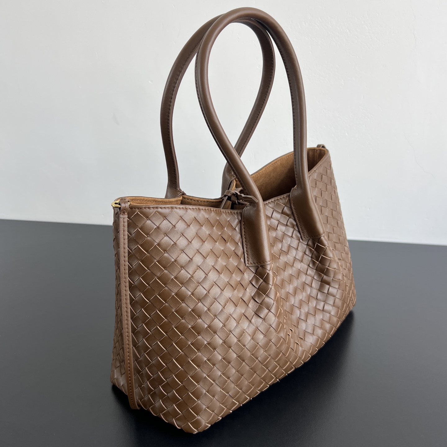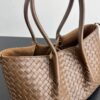 보테가 베네타의 피나코테카 중형 토트백은 브랜드의 상징적인 엮음 공예로 제작되었습니다.