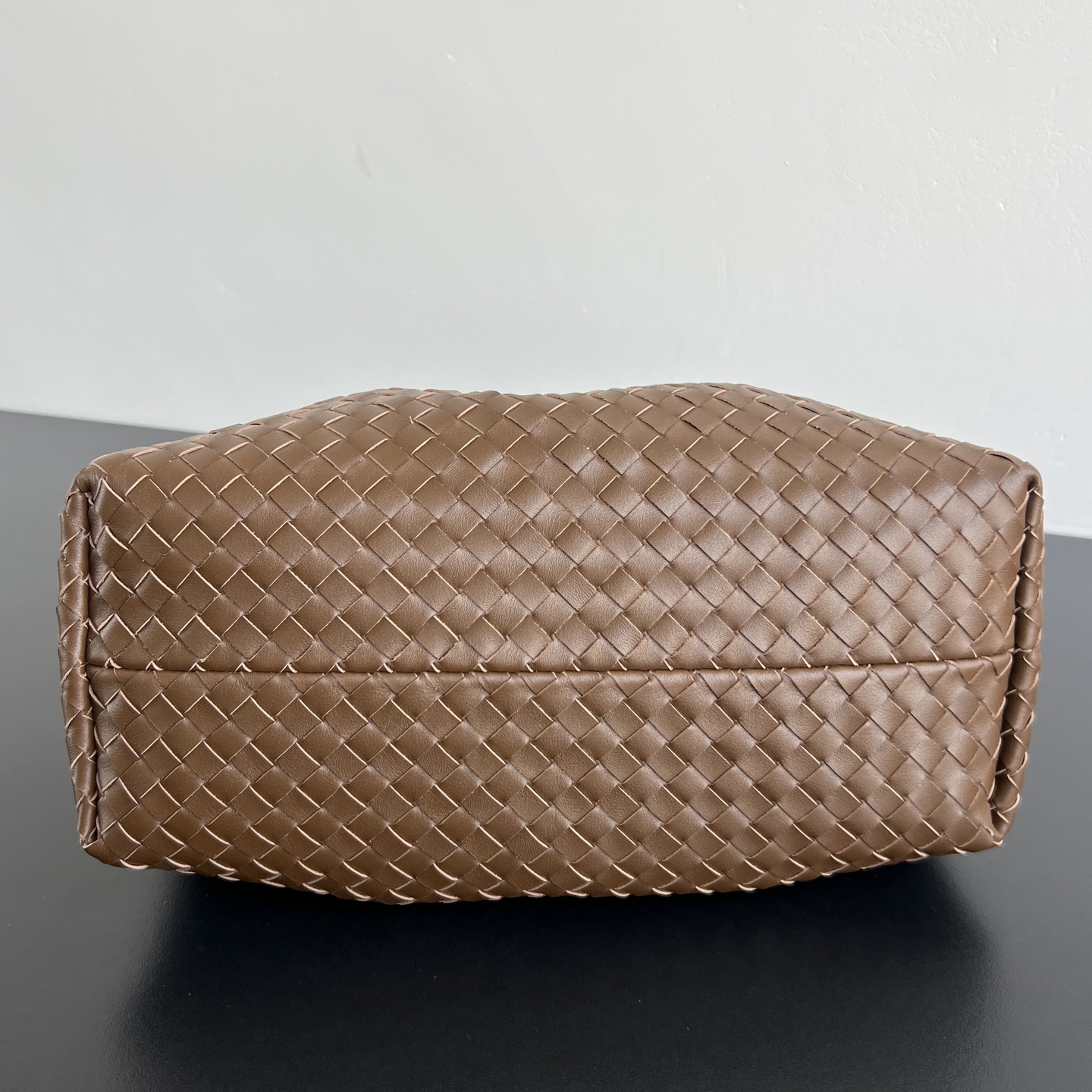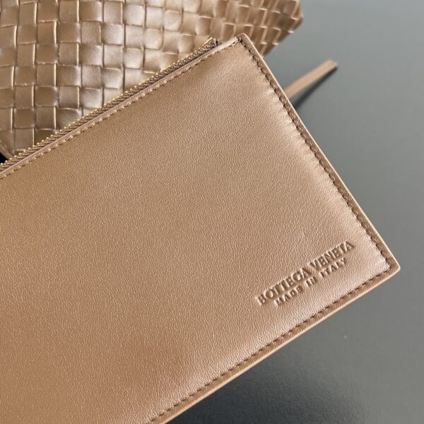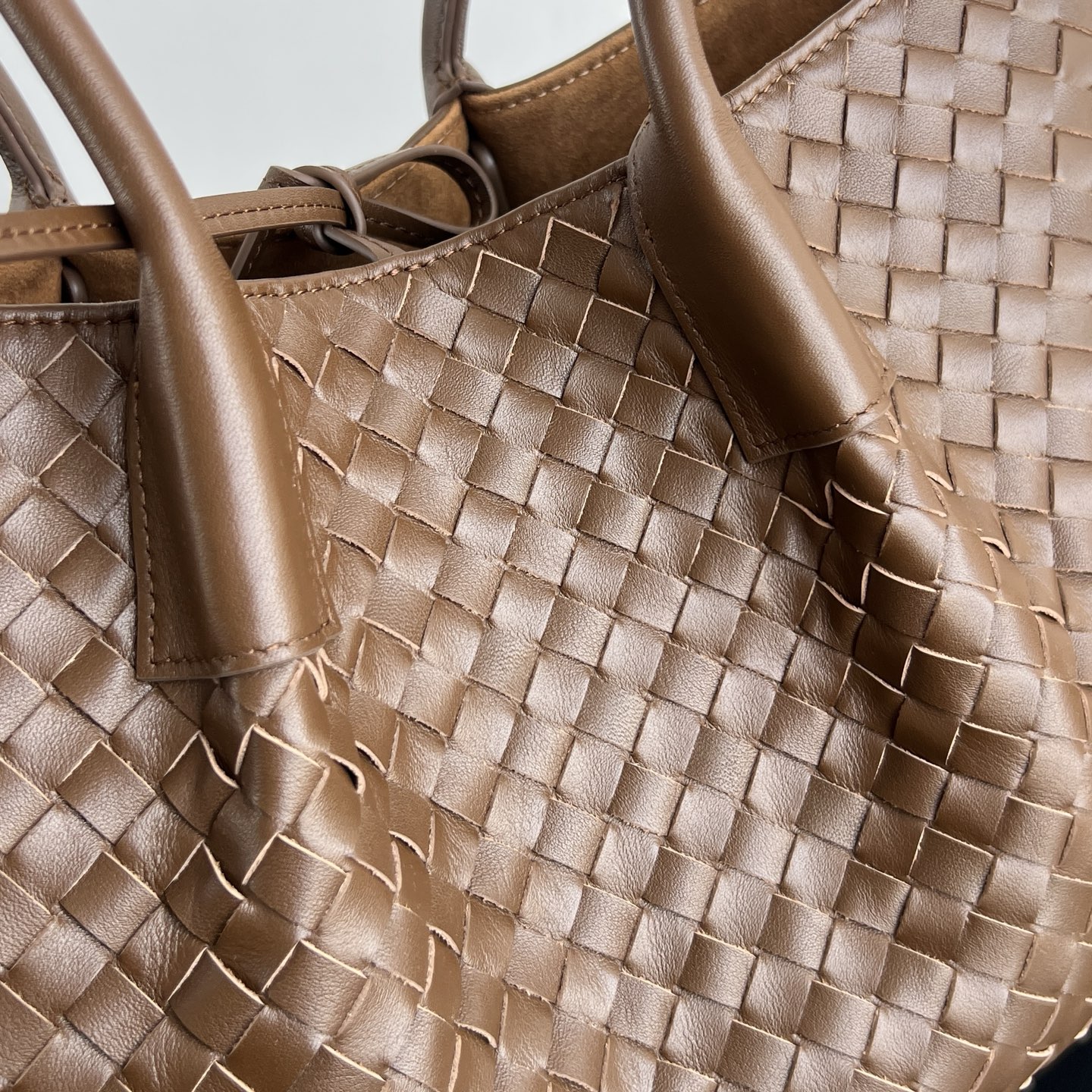 보테가 베네타의 피나코테카 중형 토트백은 브랜드의 상징적인 엮음 공예로 제작되었습니다.
