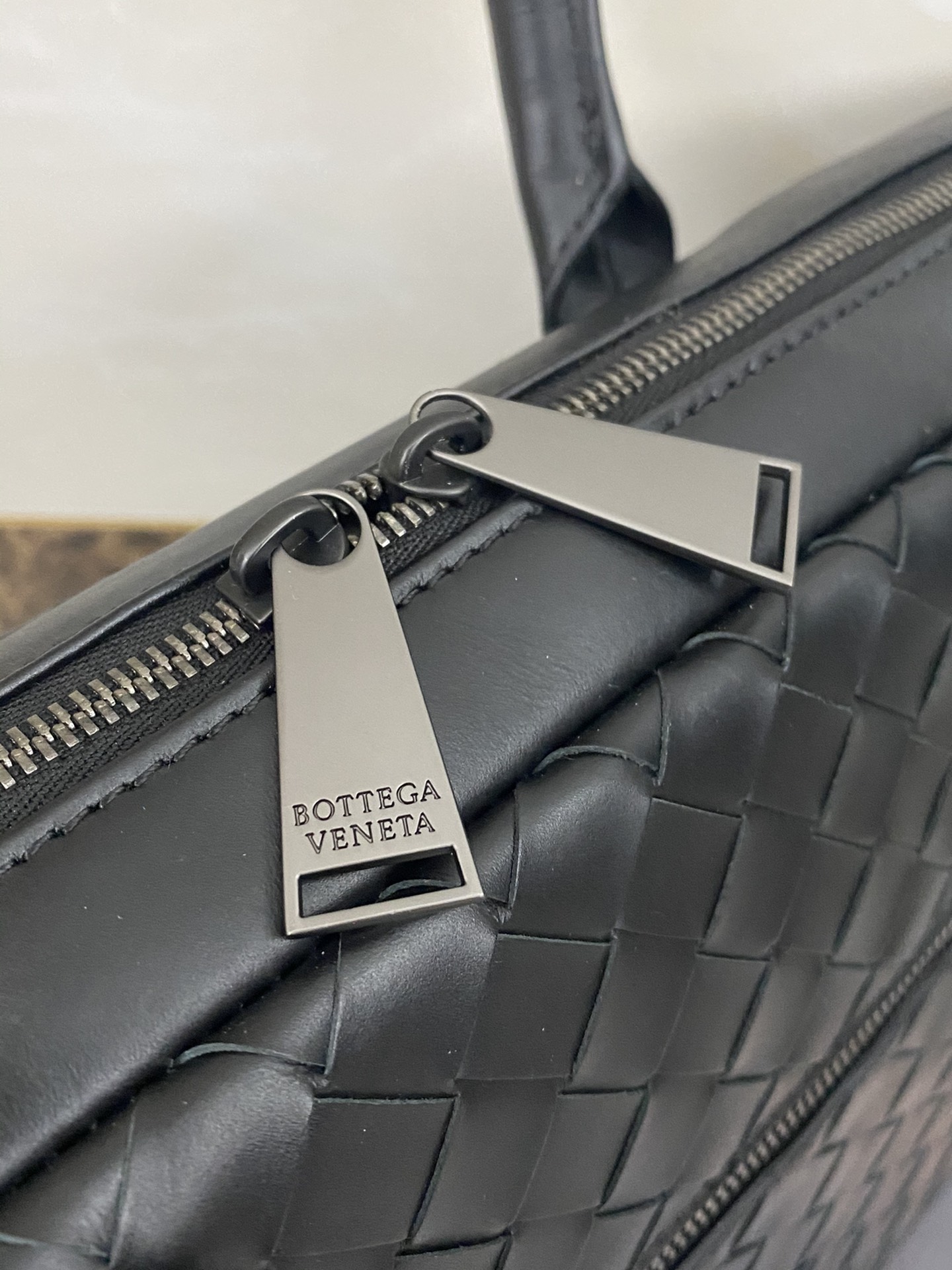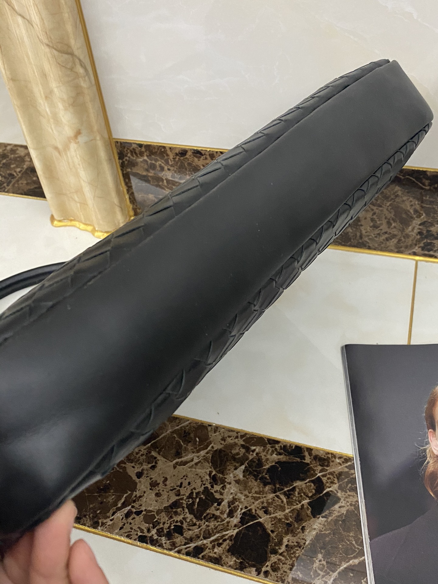 전체적으로 수작업으로 넓게 엮은 위빙 패턴이 돋보이며, 측면은 부드러운 가죽 소재로 마감되어 있습니다.
