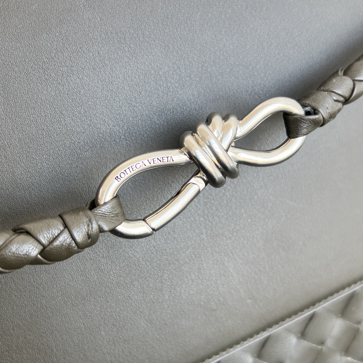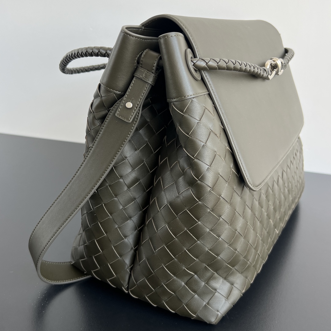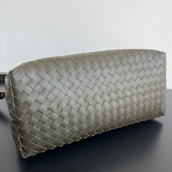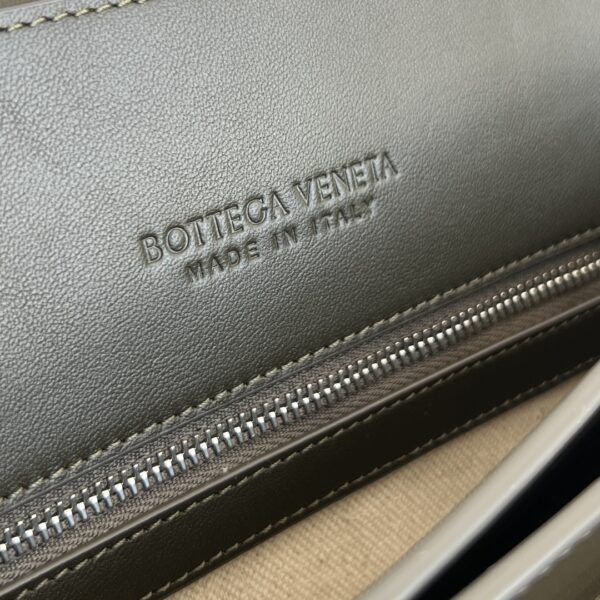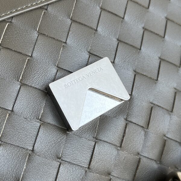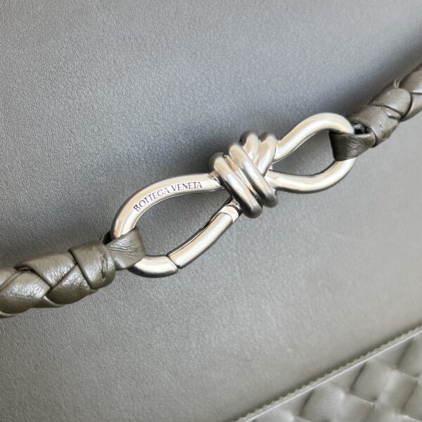 고급 소가죽의 미세한 광택과 자연스러운 질감이 돋보이며, 인트레치아토(직조) 디자인이 독특한 멋을 더합니다.