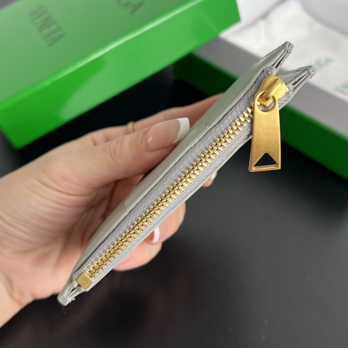 대형 직조 디자인의 지퍼 카드 지갑으로, 실용성과 스타일을 모두 갖춘 아이템입니다.