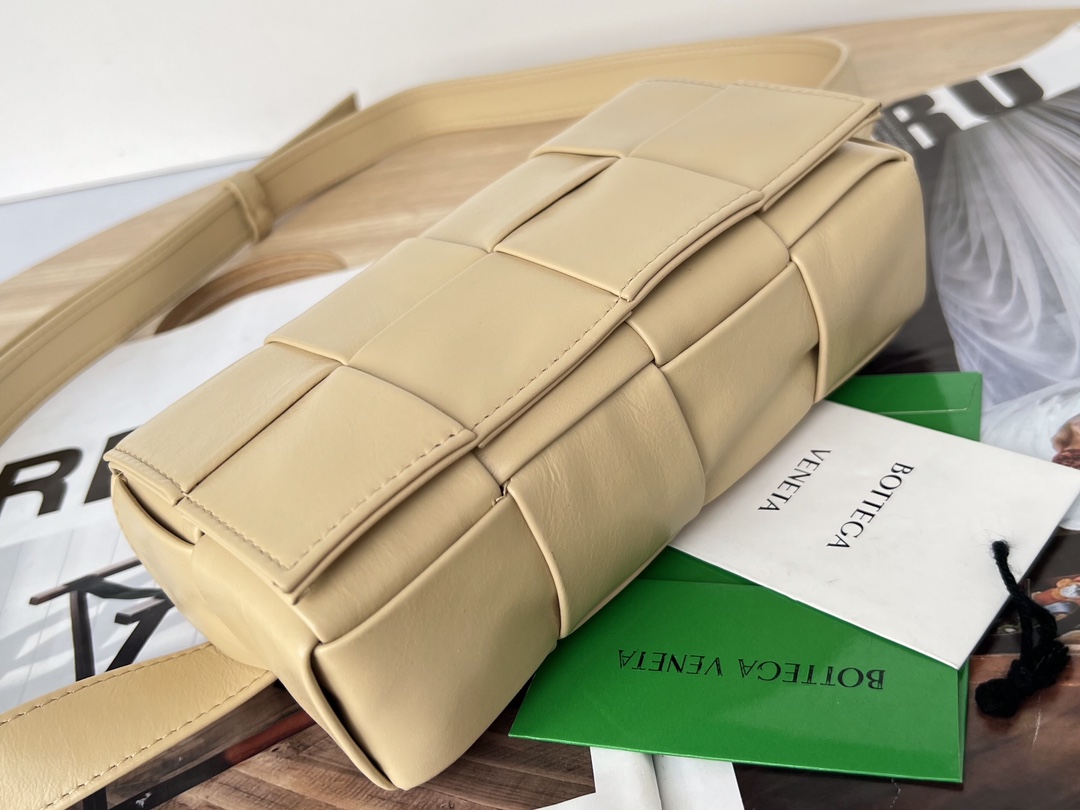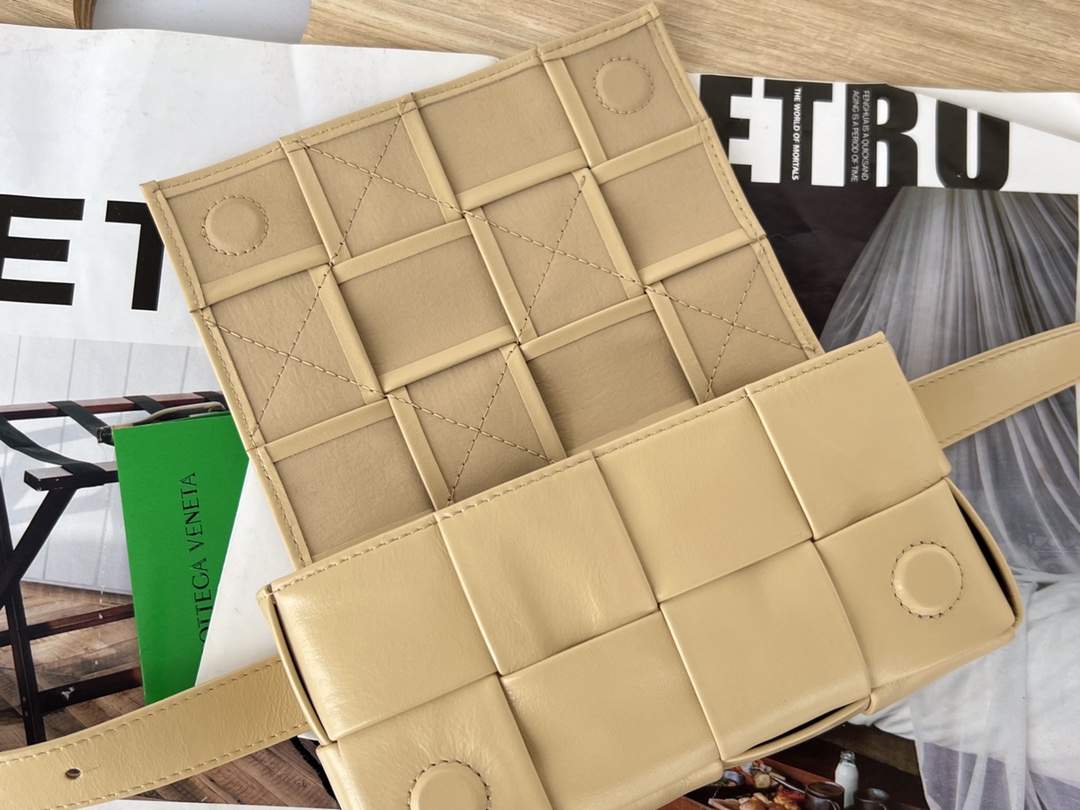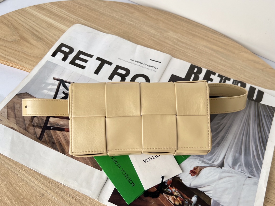 부드러운 유약 소가죽 소재로 제작된 더 벨트 카세트 백은 가벼운 무게감과 고급스러운 광택이 특징입니다.