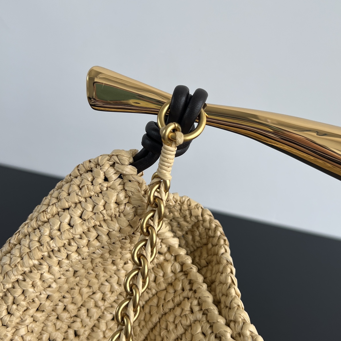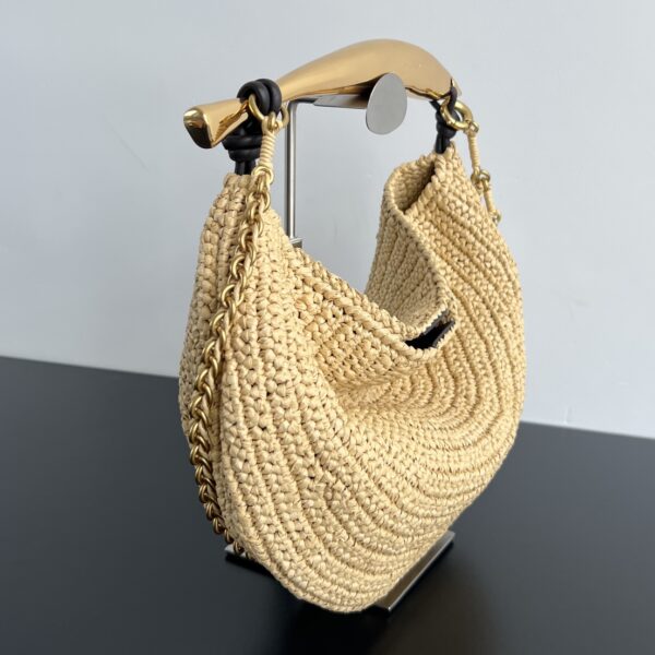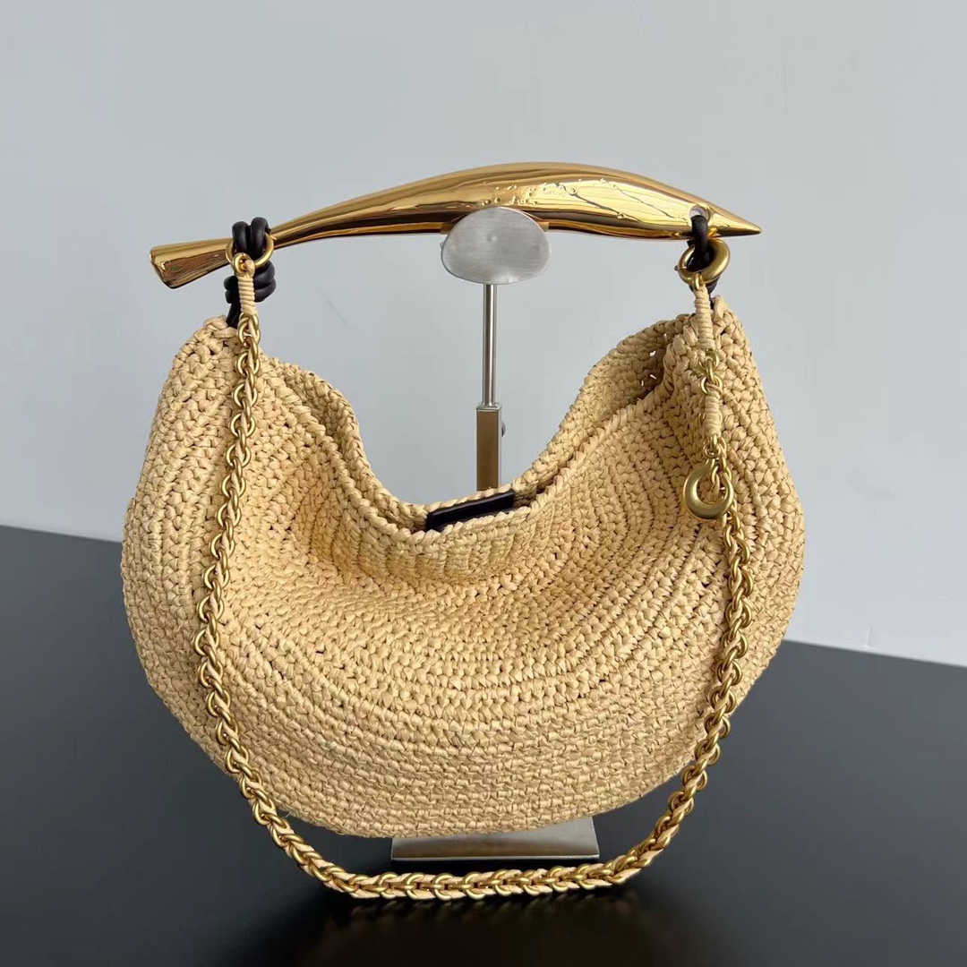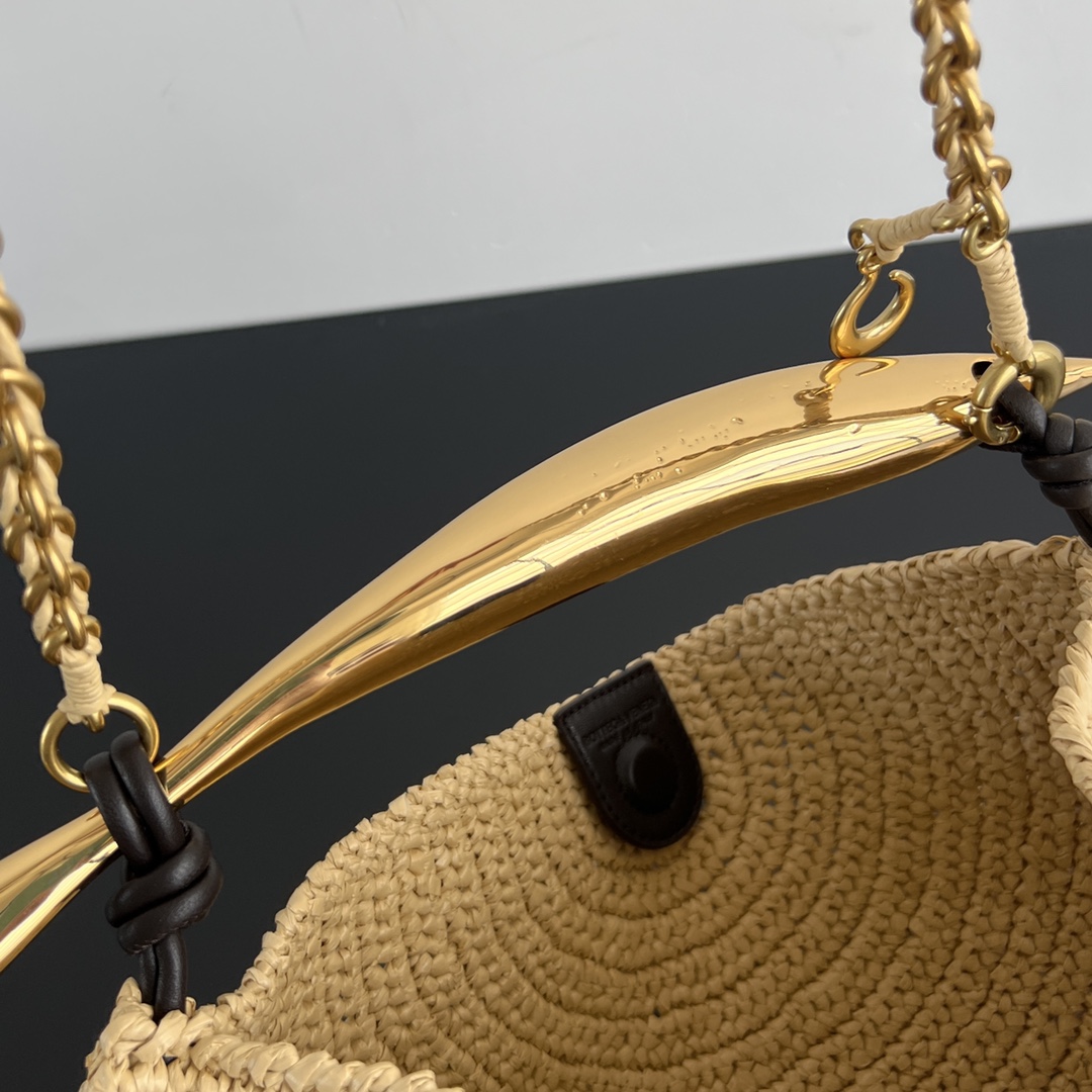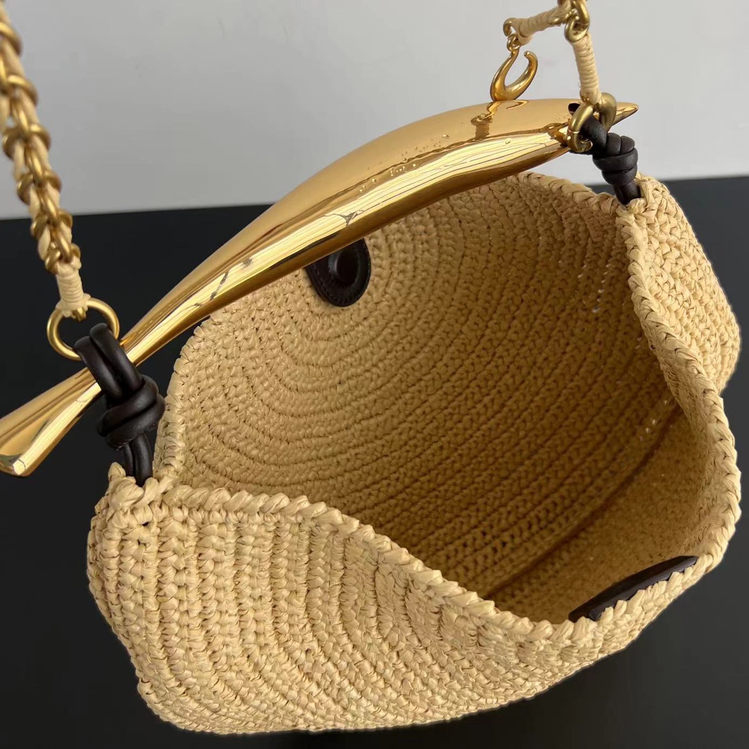 여름 한정판 라피아 크로스백입니다. 금속 손잡이와 편안한 체인 스트랩이 조화를 이루며, 섬세한 질감의 라피아 소재로 제작되었습니다.
