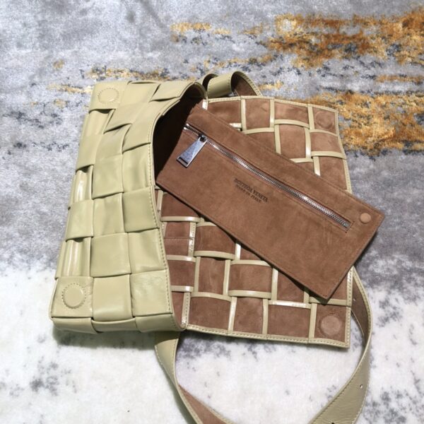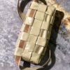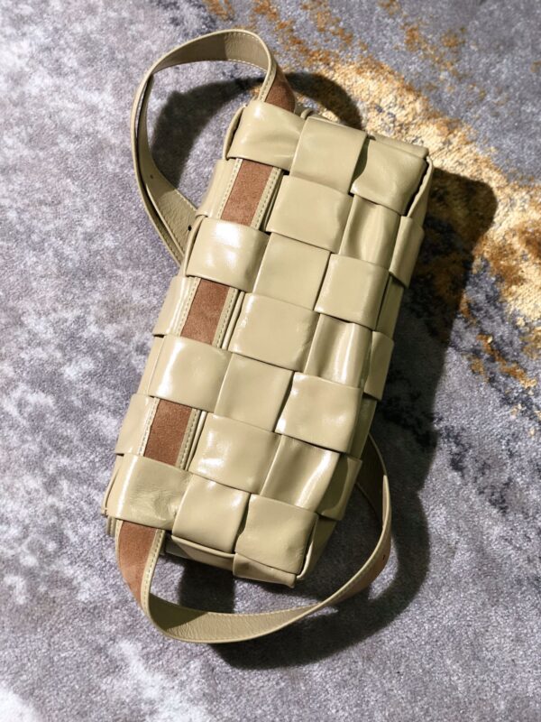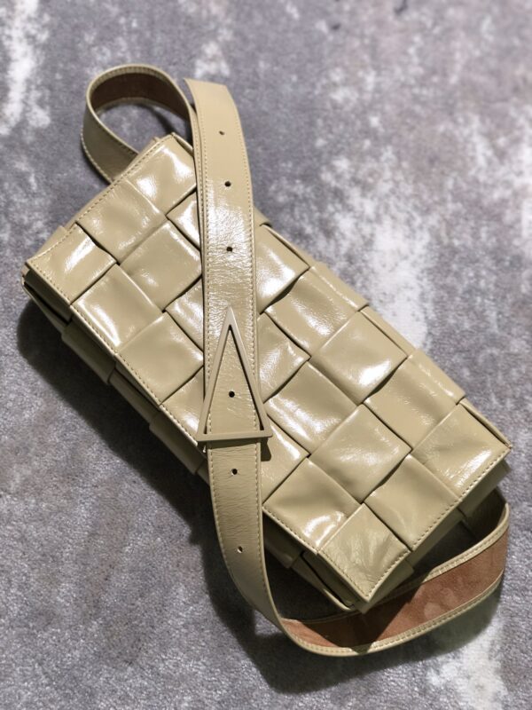 보테가의 마법 큐브 위빙 백은 독특한 삼각형 디자인의 어깨끈이 특징입니다. 공식적으로는 크로스백으로 소개되지만, 손에 들거나 허리에 착용할 수도 있어 다양한 스타일로 활용 가능합니다.