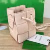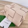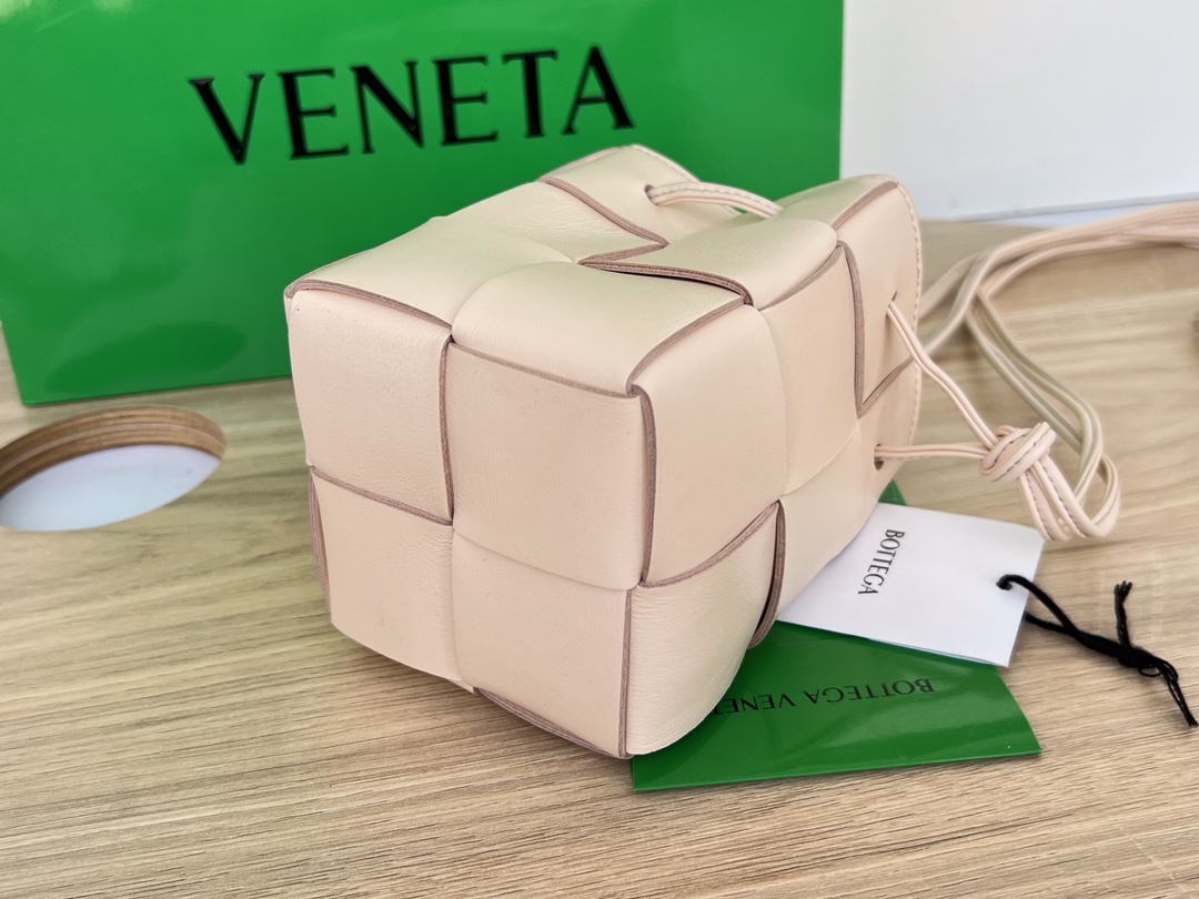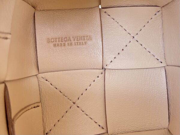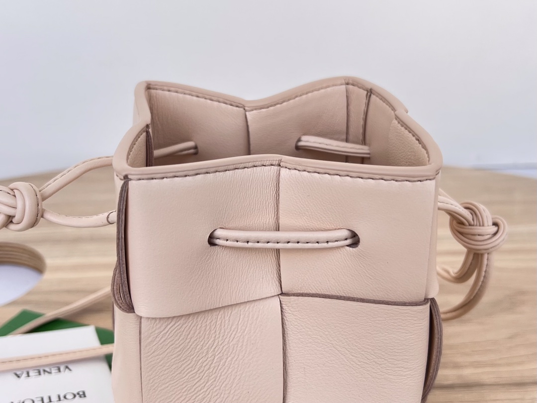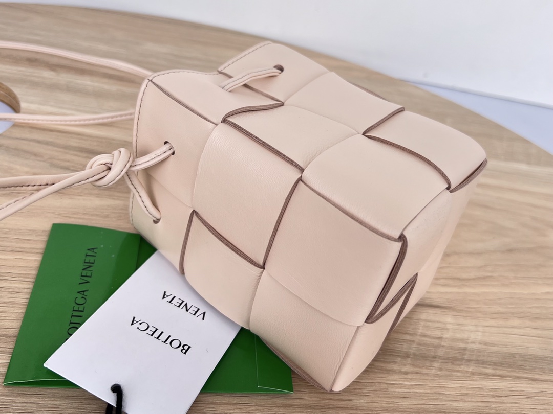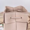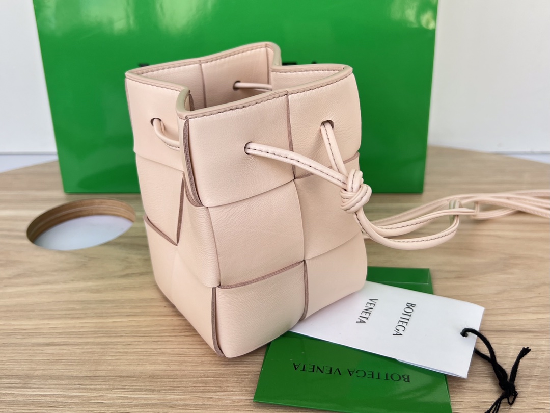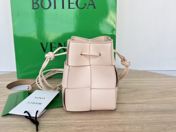 보테가의 새로운 물병형 버킷백은 클래식한 엮음 디자인이 돋보입니다.