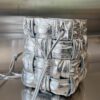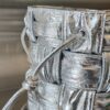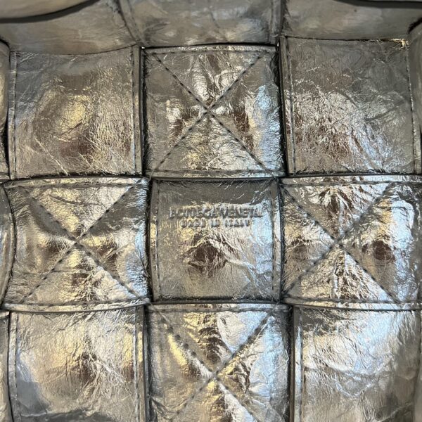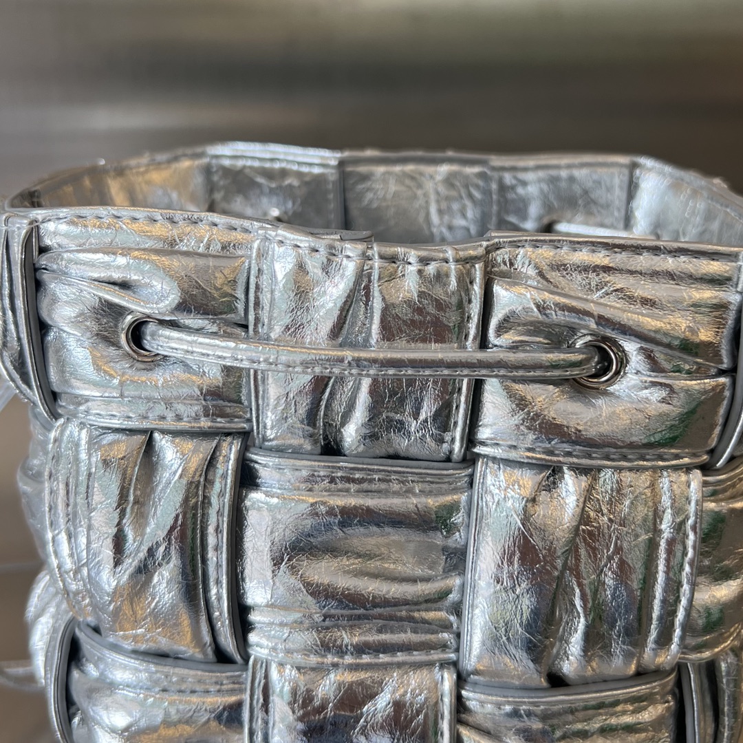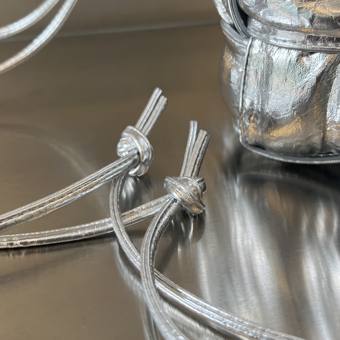 고급스러운 유광의 실버 컬러가 돋보이는 보테가의 물통 주름형 백입니다.