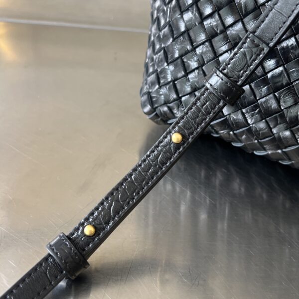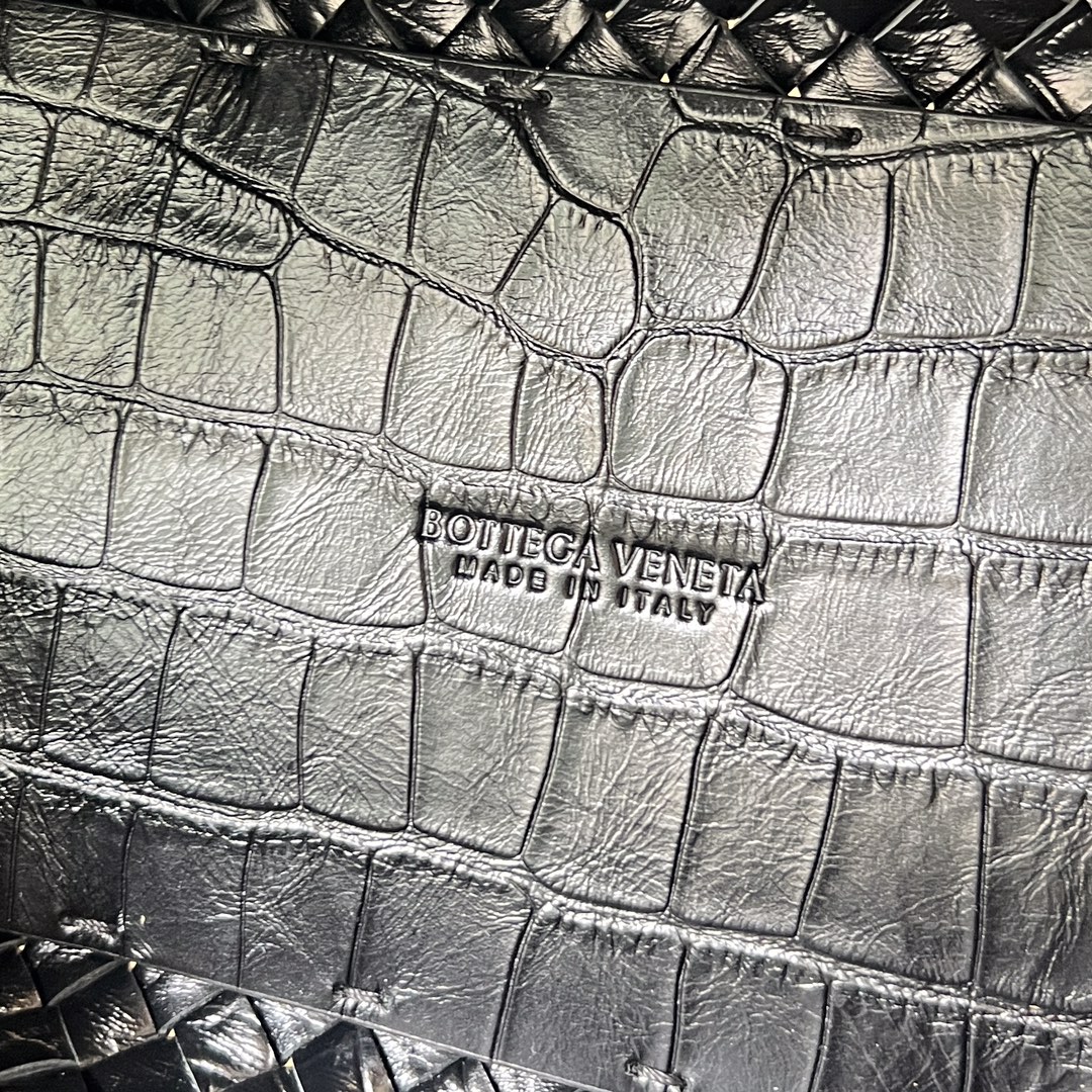 보테가의 미니 카바트는 클래식한 디자인으로, 고급스러운 악어가죽 패턴이 돋보입니다.
