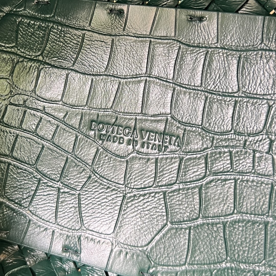 보테가의 미니 카바트는 클래식한 디자인으로, 고급스러운 크로커다일 가죽을 사용하여 시각적으로 매력적인 반사 효과를 제공합니다.