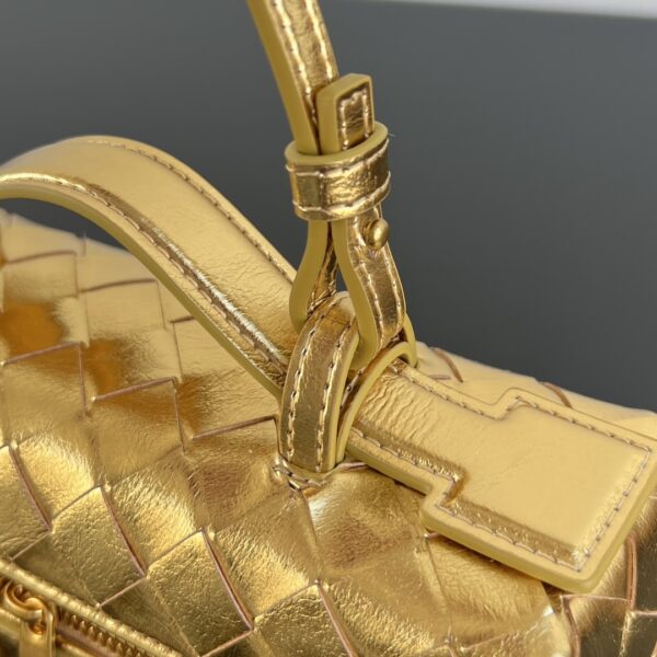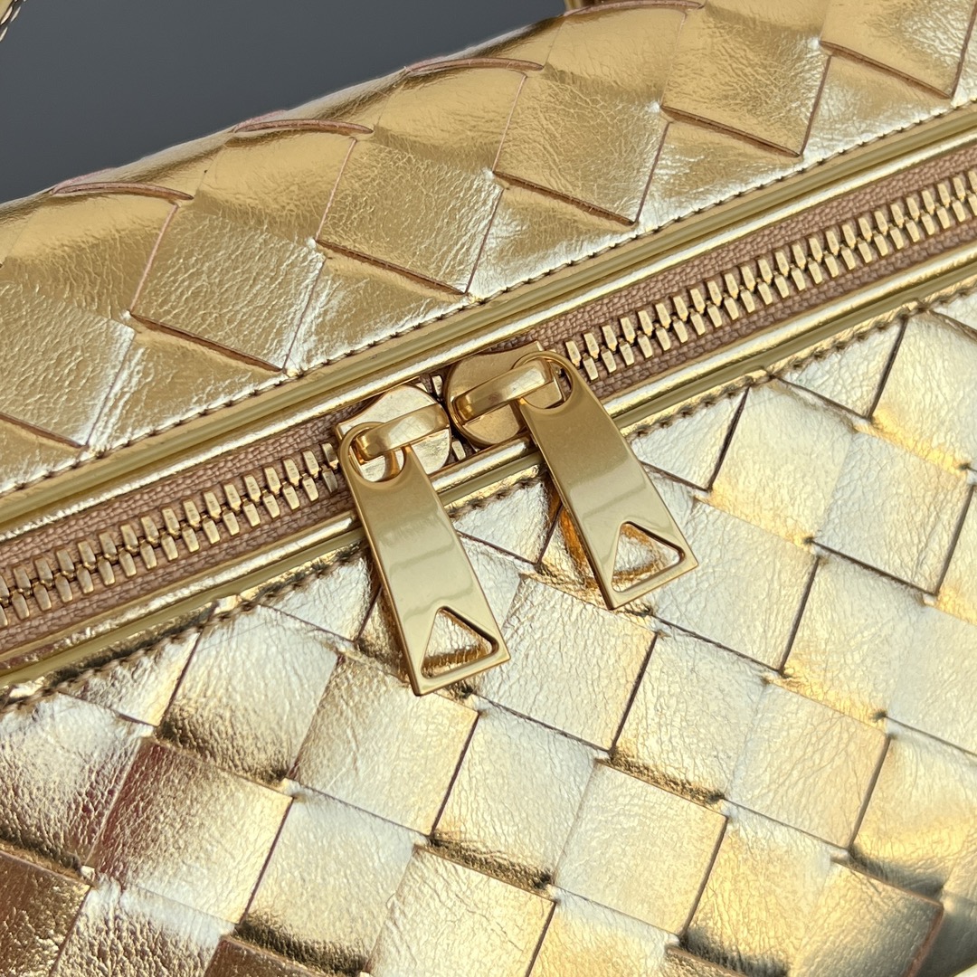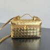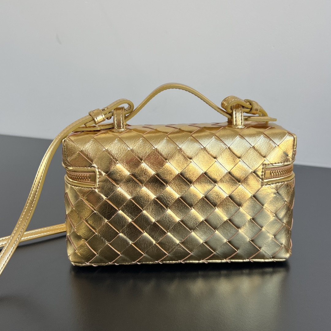 보테가의 바니티 케이스는 금속 광택감이 돋보이는 매력적인 디자인입니다.