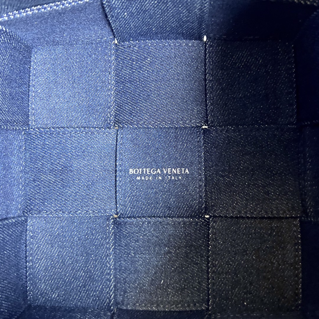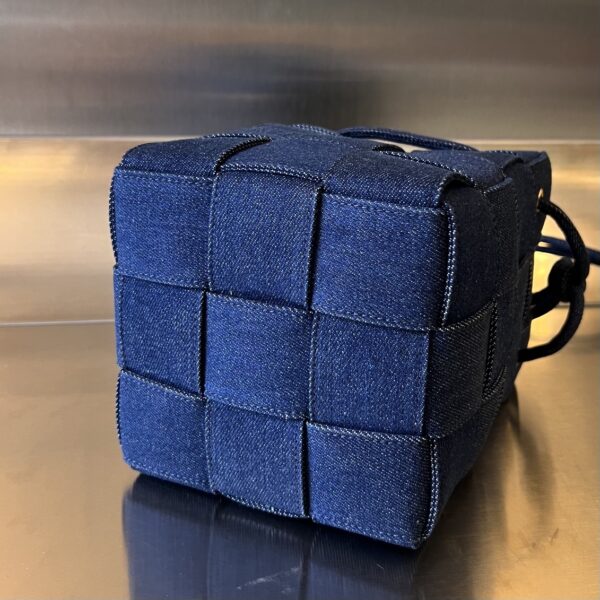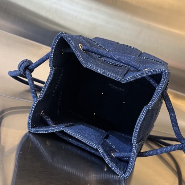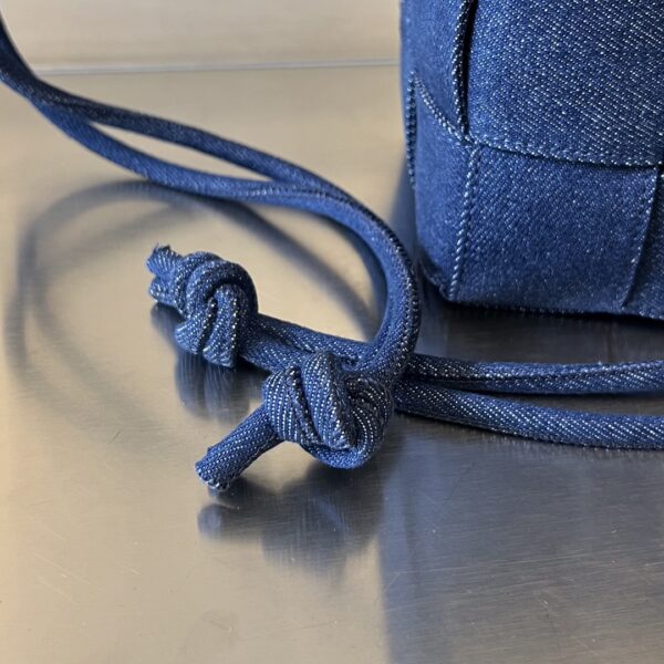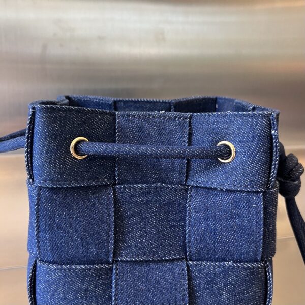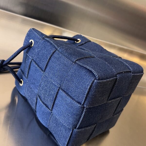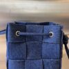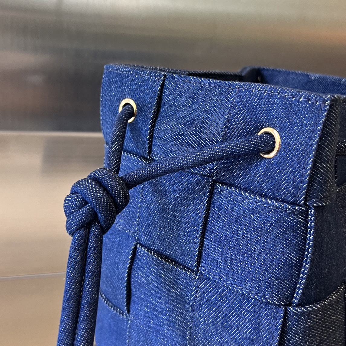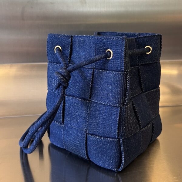 부드럽고 내구성이 뛰어난 데님 소재로 제작된 버킷백입니다.