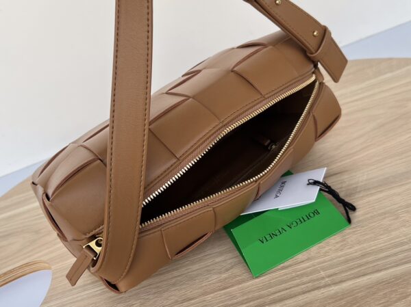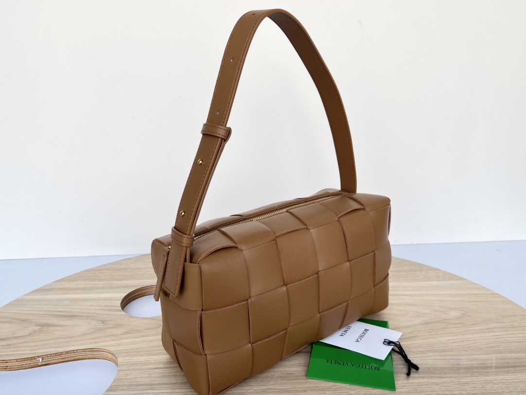보테가의 브릭 카세트 숄더백은 전통적인 엮음 디자인으로 시선을 사로잡습니다.