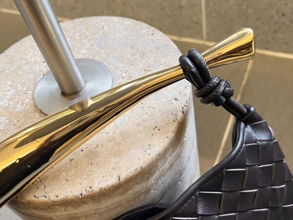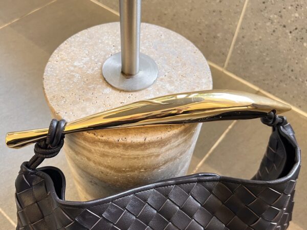 최고급 양가죽으로 제작된 이 가방은 반달 형태로, 세련된 디자인이 돋보입니다. 금속 손잡이는 클래식한 엮음과 결합되어 독특한 매력을 더합니다.