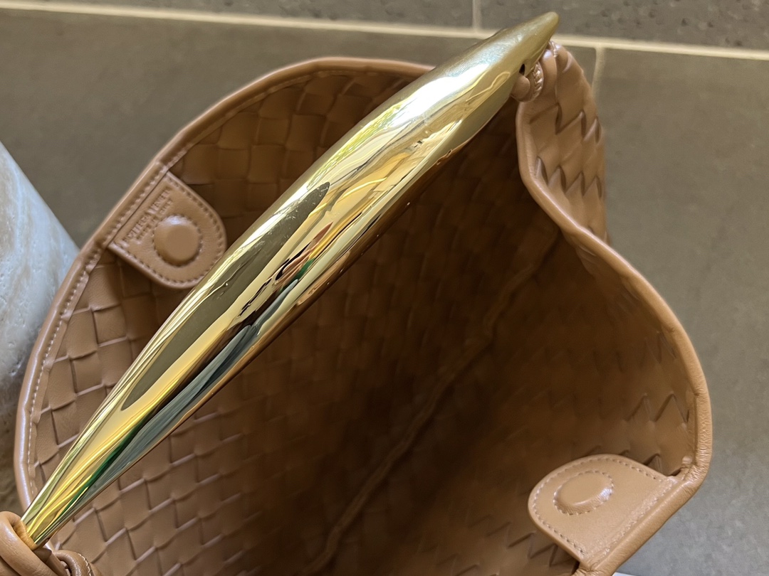 독특한 금속 핸들이 클래식한 직조와 조화를 이루어 예술적이고 세련된 느낌을 더합니다. 각 핸들은 독특한 질감을 가지고 있어 개성을 강조합니다.