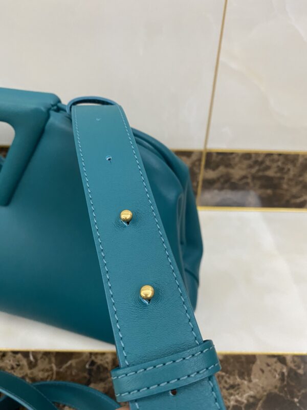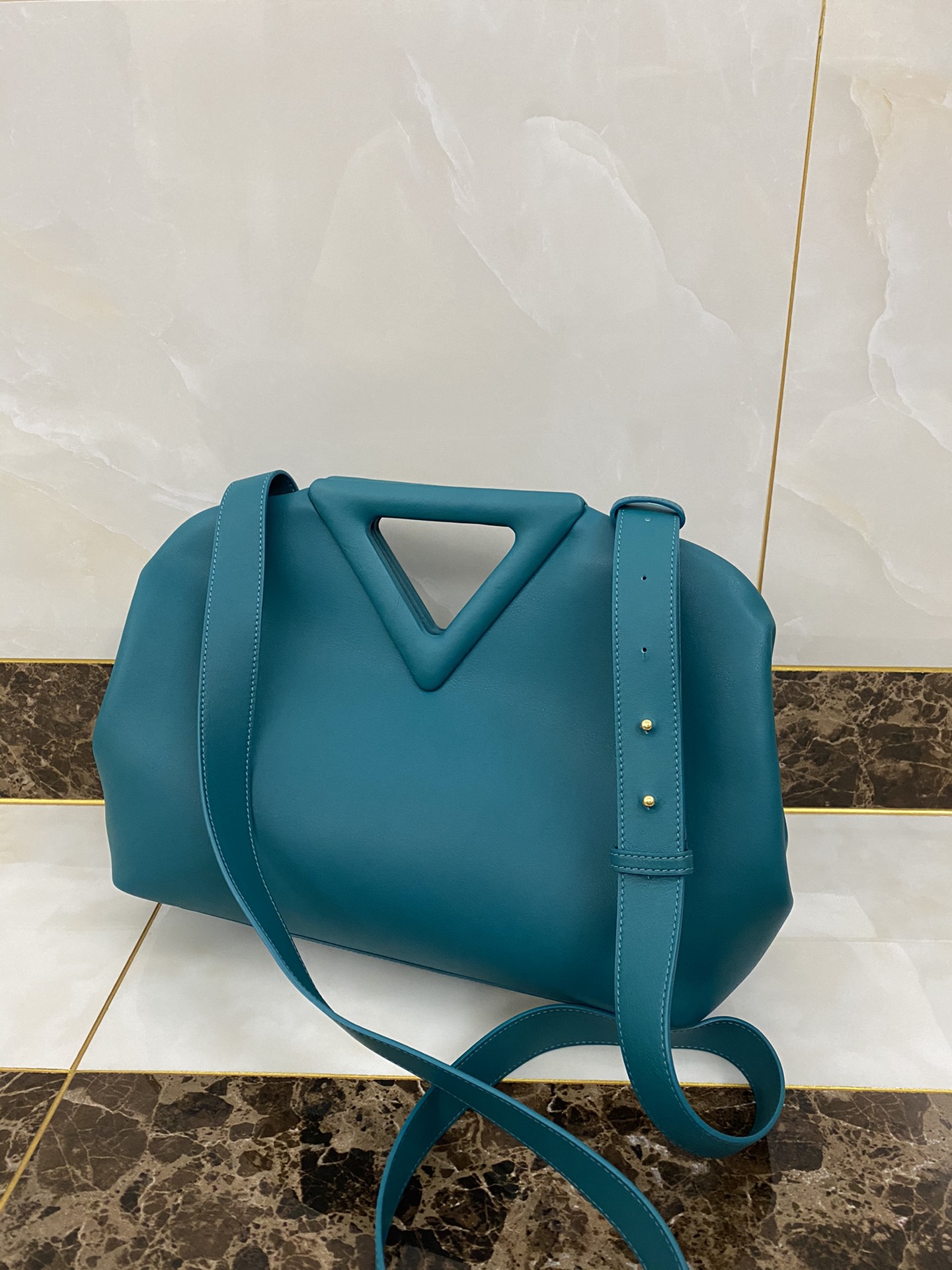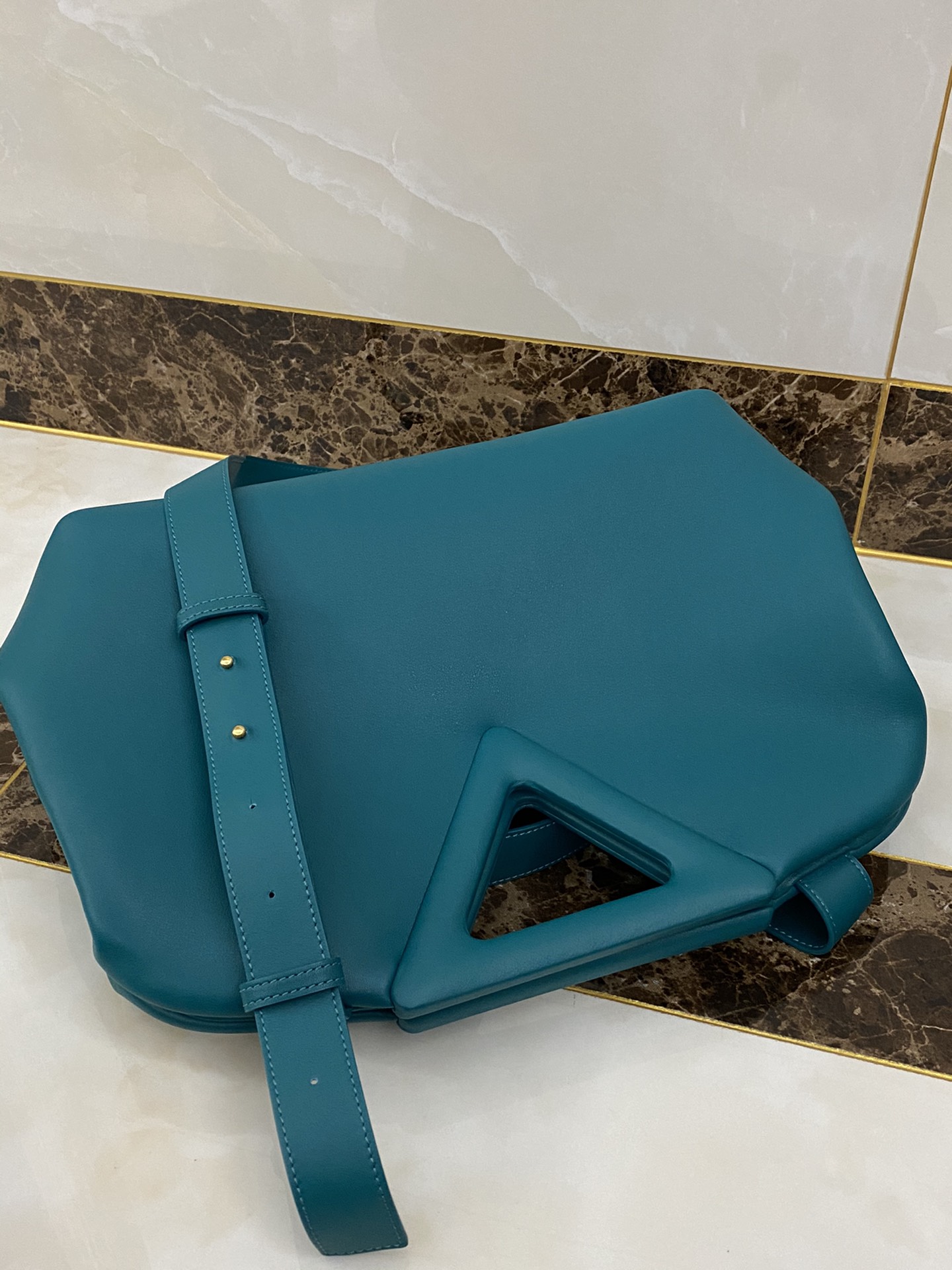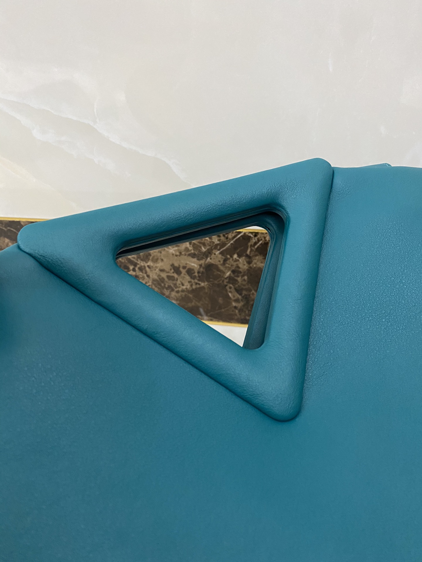 부드러운 파스텔 블루 컬러의 삼각형 손잡이백입니다.