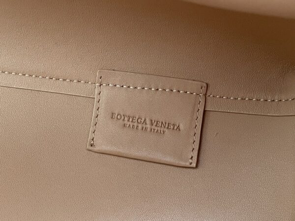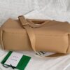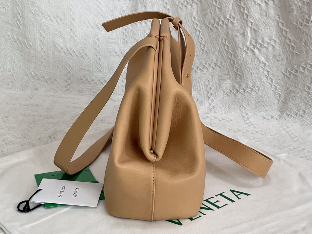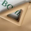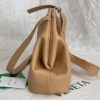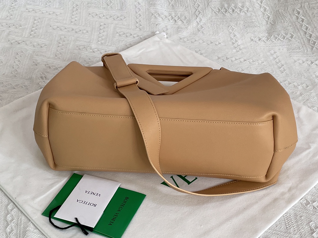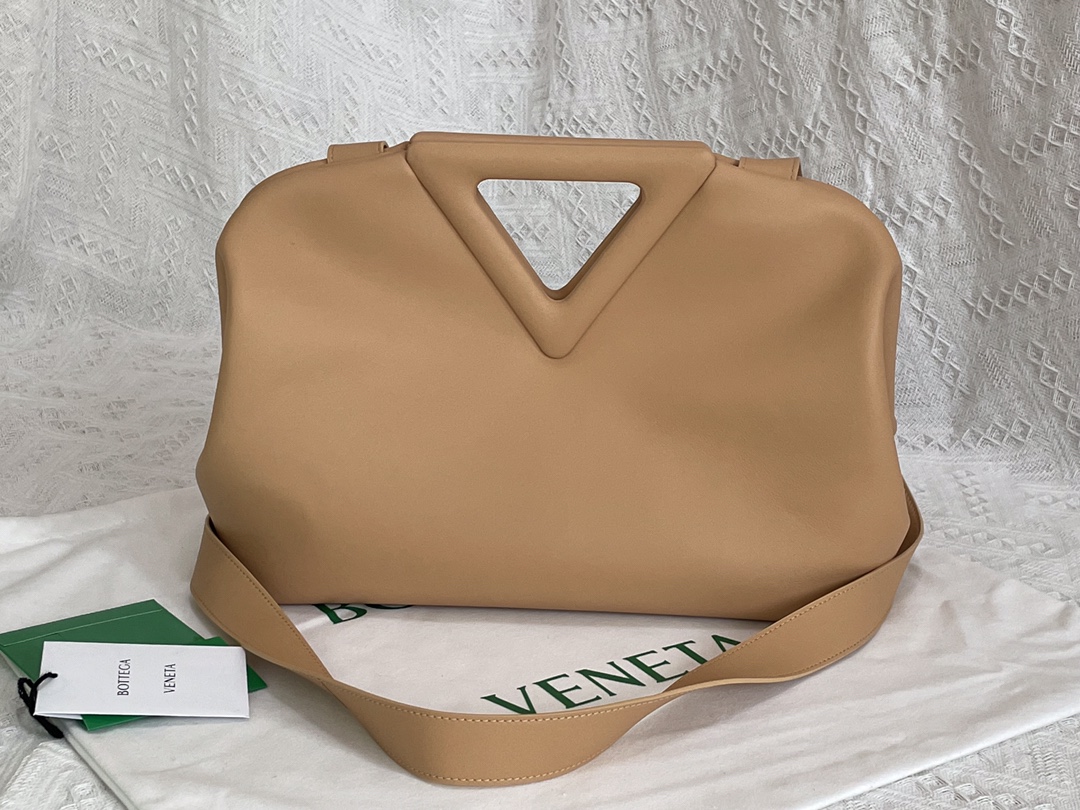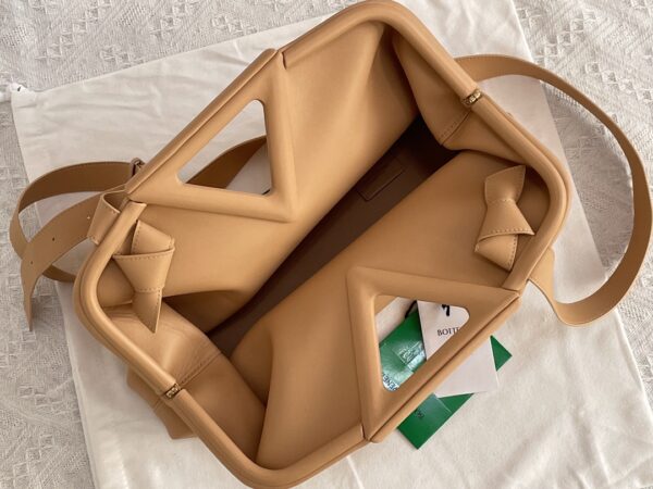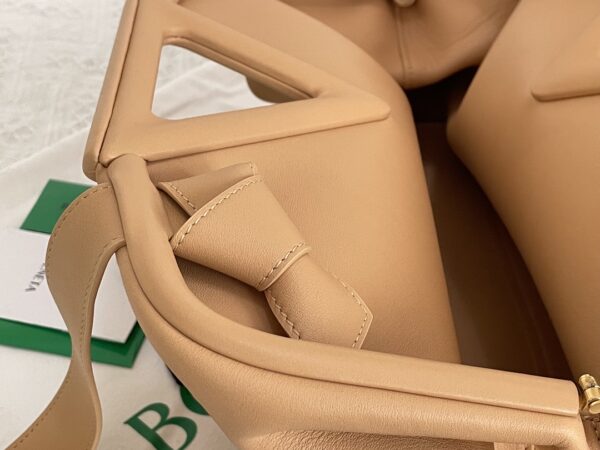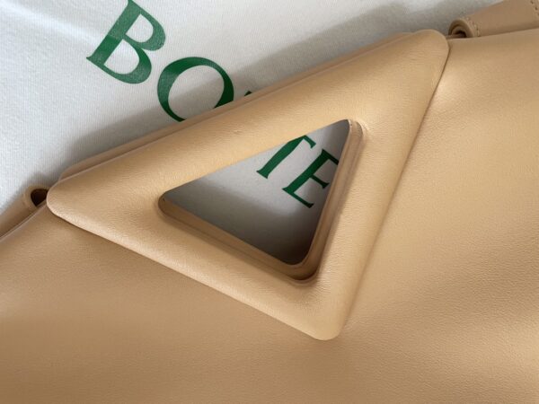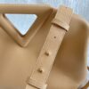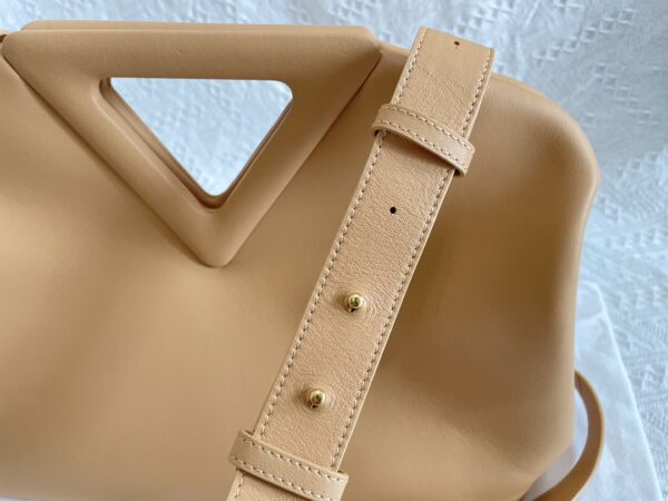 부드러운 파스텔 핑크 컬러의 삼각형 손잡이백입니다. 이 가방은 소가죽으로 제작되어 자연스러운 주름이 특징입니다.