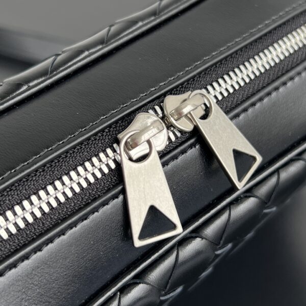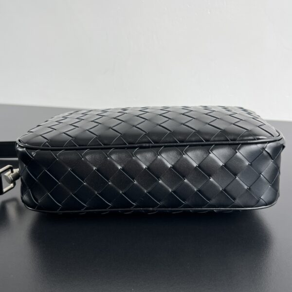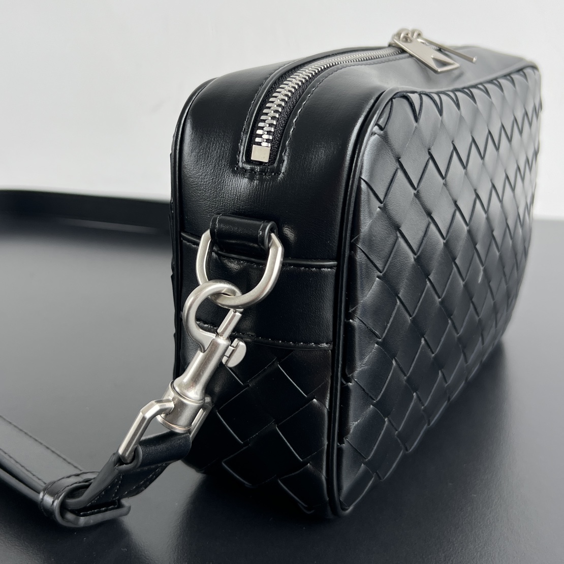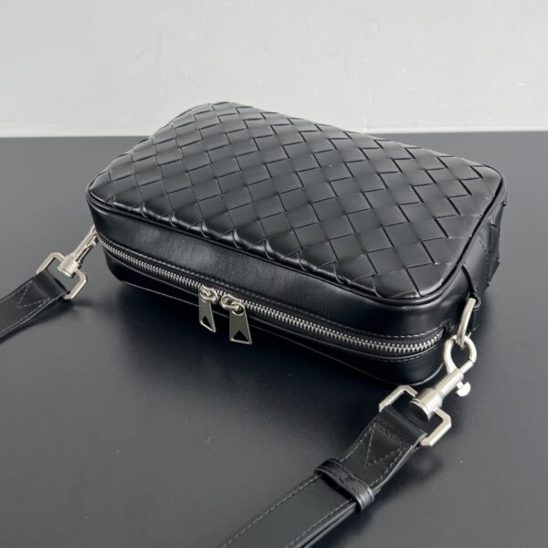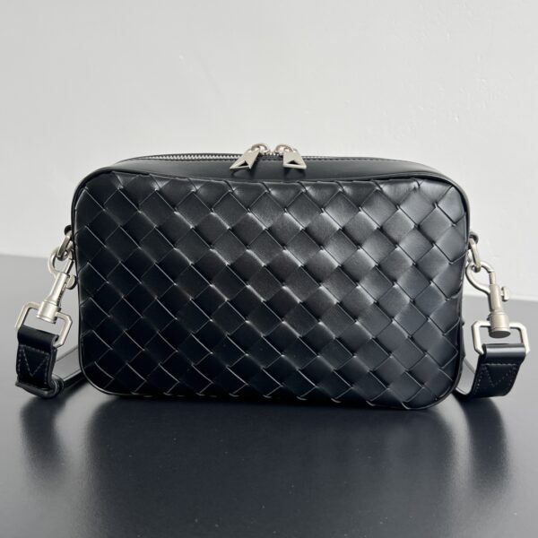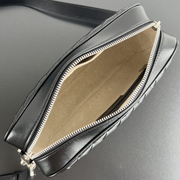 부드러운 소가죽으로 제작된 보테가의 새틴 카메라 백입니다. 고급스러운 위빙 디자인이 돋보이며, 두 개의 지퍼로 안전하게 수납할 수 있습니다.