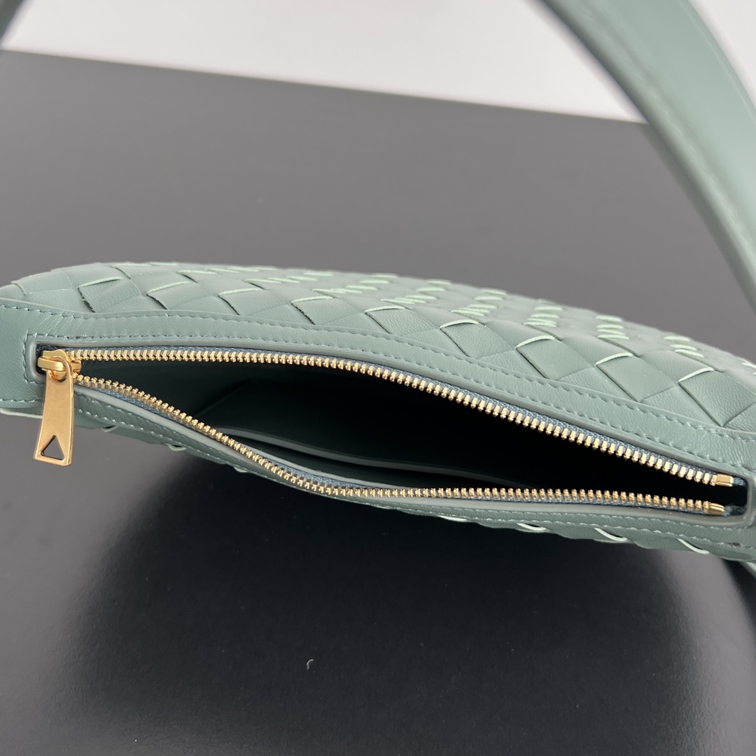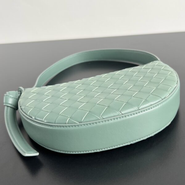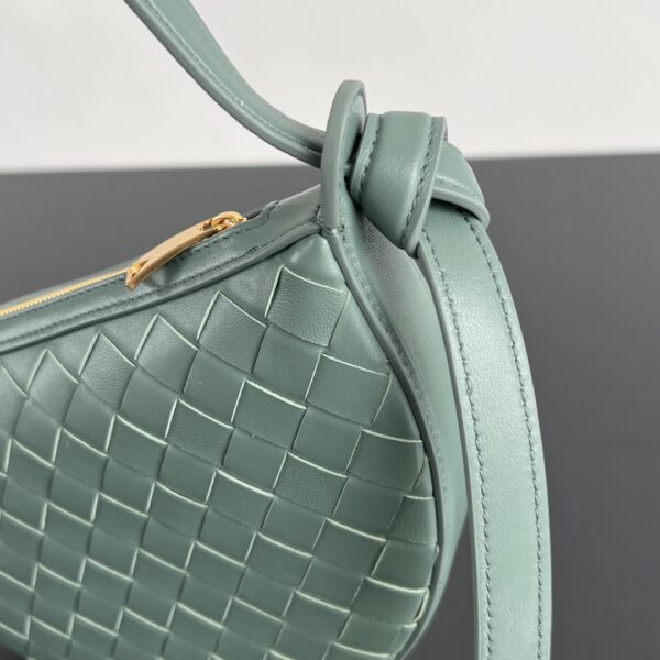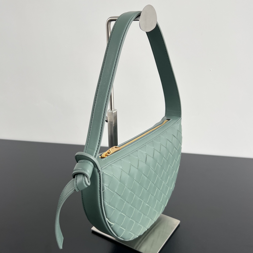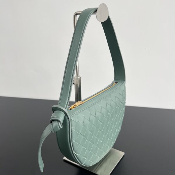 보테가의 선라이즈 반달형 숄더백은 로맨틱한 디자인이 매력적입니다. 소가죽으로 정교하게 엮여져 있어 고급스러움을 더하며, Knot 로프 디테일이 우아함을 강조합니다.