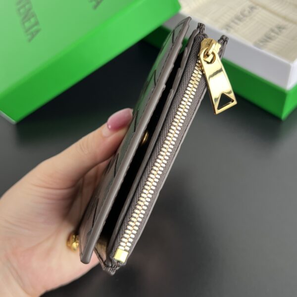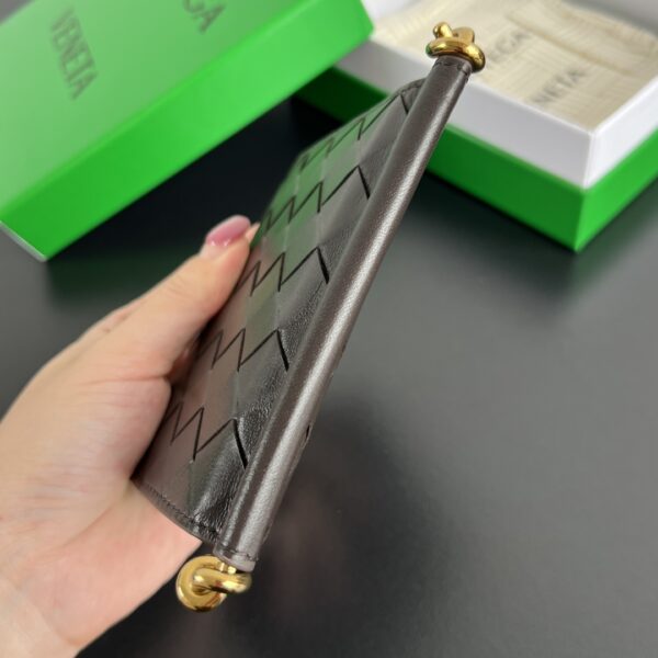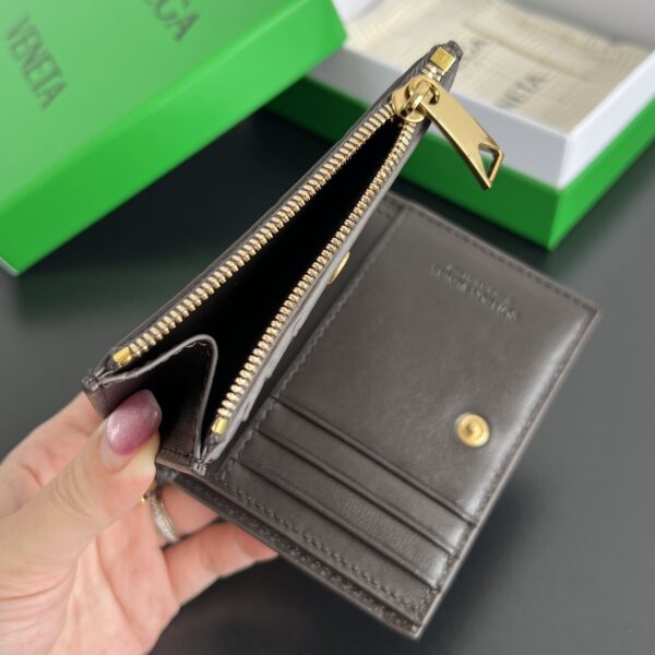 클래식한 편직 가죽과 금속 디테일이 조화를 이루는 보테가의 솔스티스 시리즈 짧은 지갑입니다.