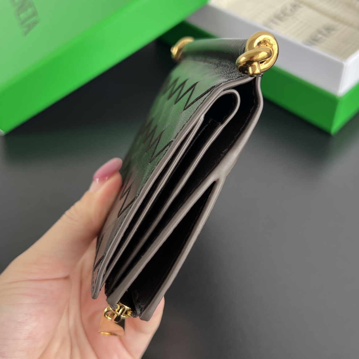 클래식한 편직 가죽과 금속 디테일이 조화를 이루는 보테가의 솔스티스 시리즈 짧은 지갑입니다.