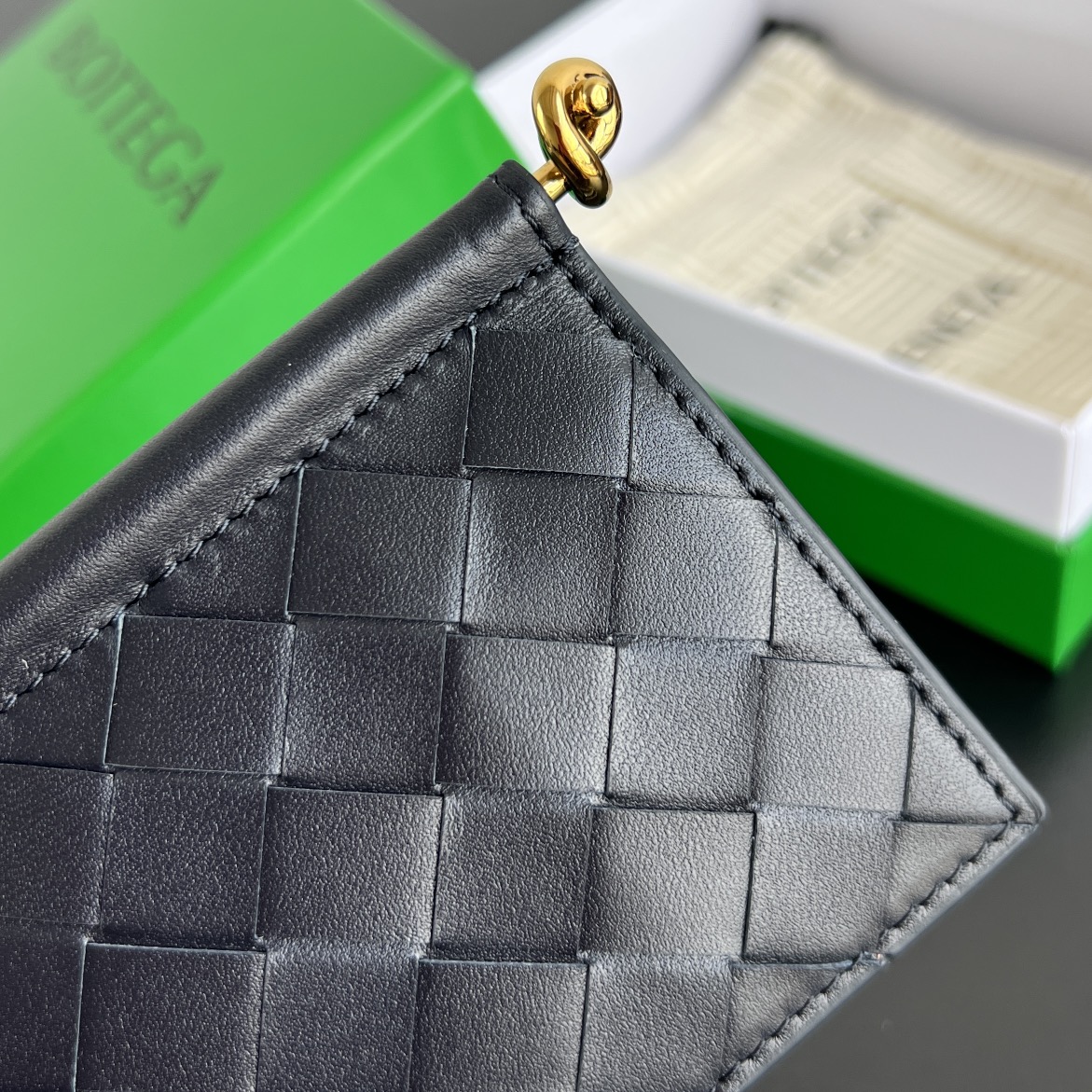 클래식한 편직 디자인과 금속 디테일이 조화를 이루어 세련된 느낌을 줍니다.