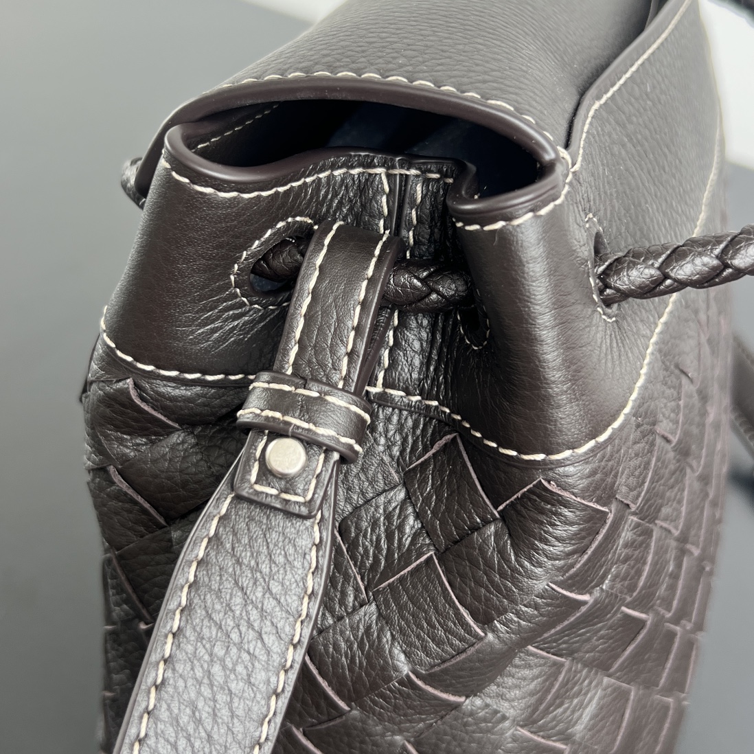 반광택의 외관과 자연스러운 엮임 텍스처가 조화를 이루며, Knot 실버 버클이 세련된 포인트를 더합니다.