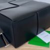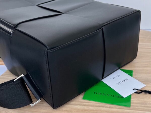 보테가의 신형 사각 편직 백팩이 새롭게 출시되었습니다. 고급스러운 블랙 컬러와 세련된 수직 편직 디자인이 특징으로, 현대적인 미감을 자아냅니다.