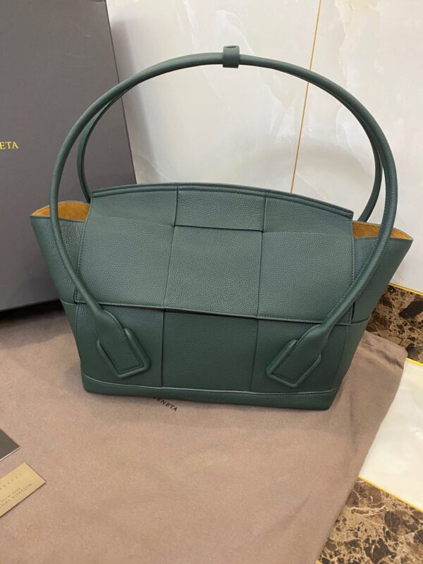 아르코 디자인의 독특한 매력을 지닌 토트백입니다. 고급스러운 가죽 소재로 제작되어 내구성이 뛰어나며, 세련된 그린 색상이 돋보입니다.