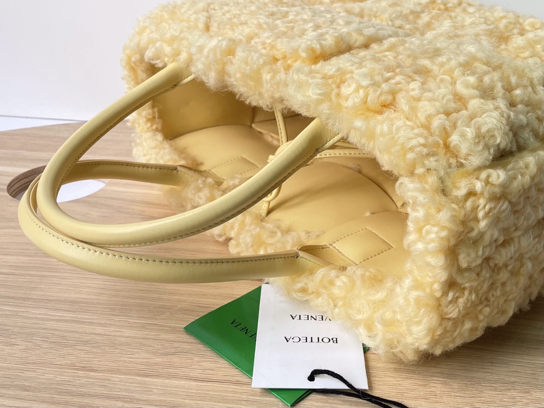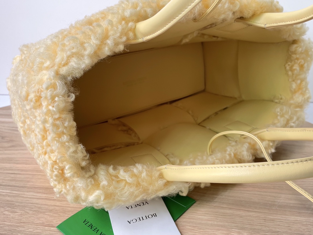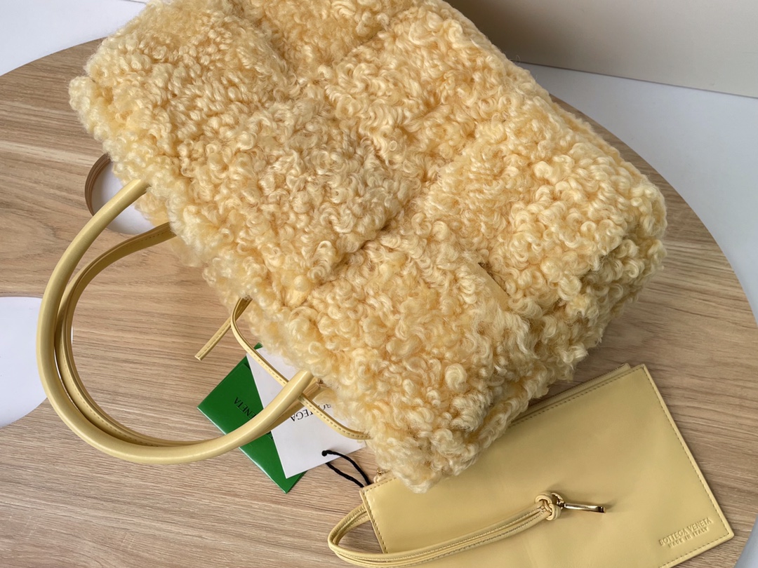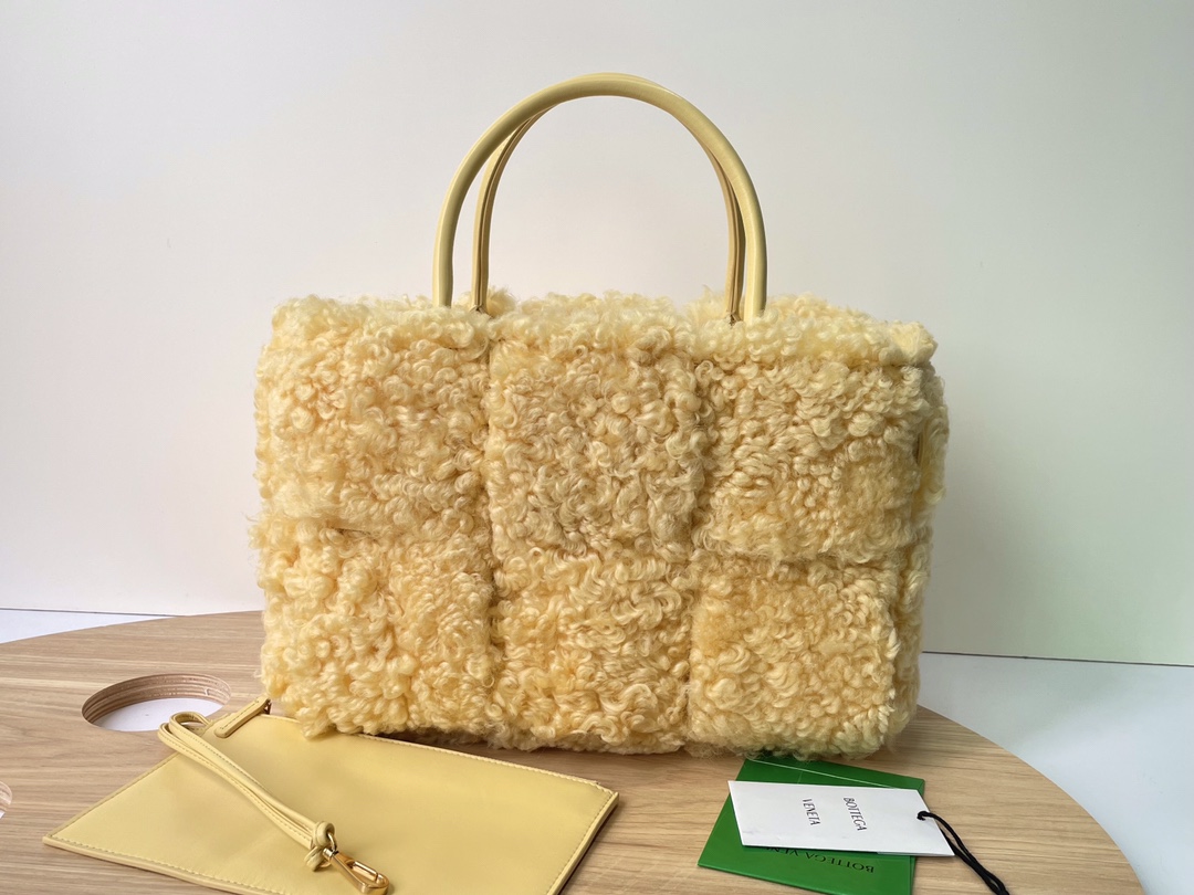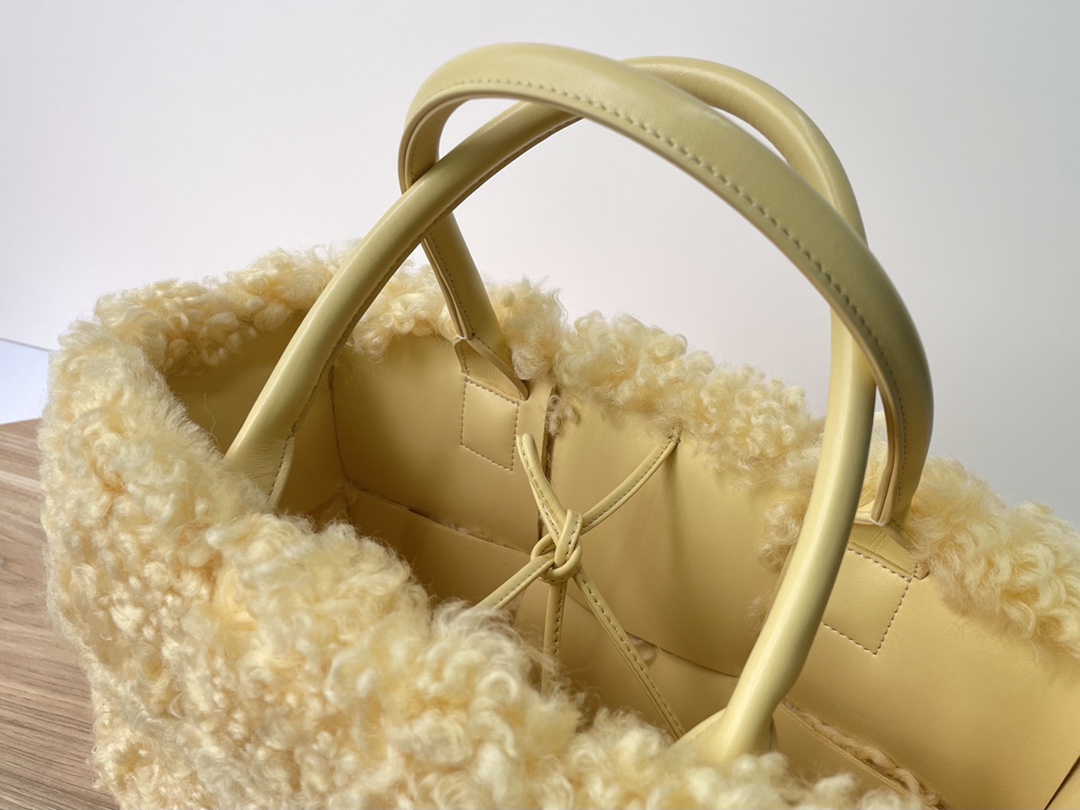 부드러운 양모 소재로 제작된 아르코 토트백입니다. 자연스러운 곱슬머리 같은 질감이 특징이며, 손에 쥐었을 때의 감촉이 매우 부드럽고 편안합니다.