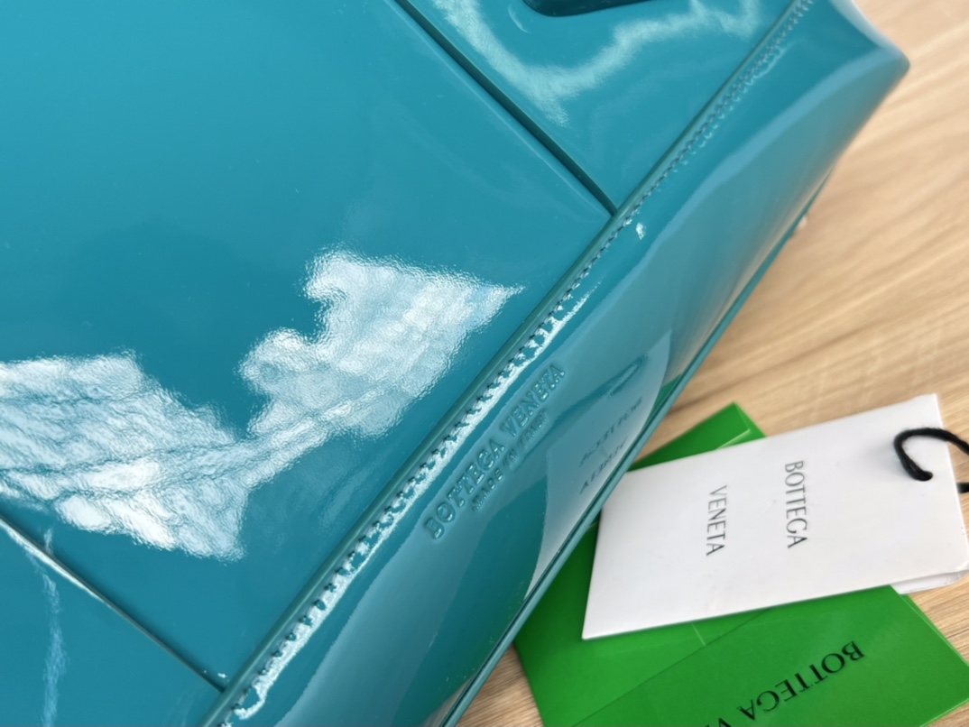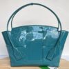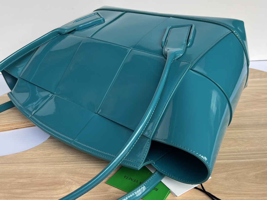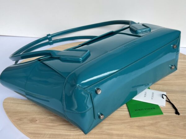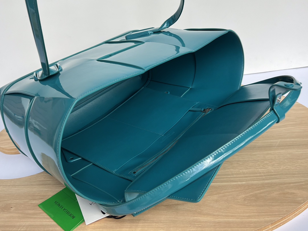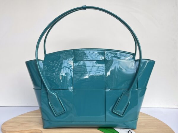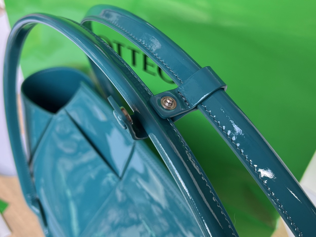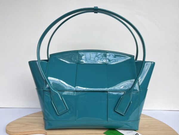 광택이 나는 페이턴트 소재로 제작된 아르코56 핸드백은 고급스러운 분위기를 자아냅니다.