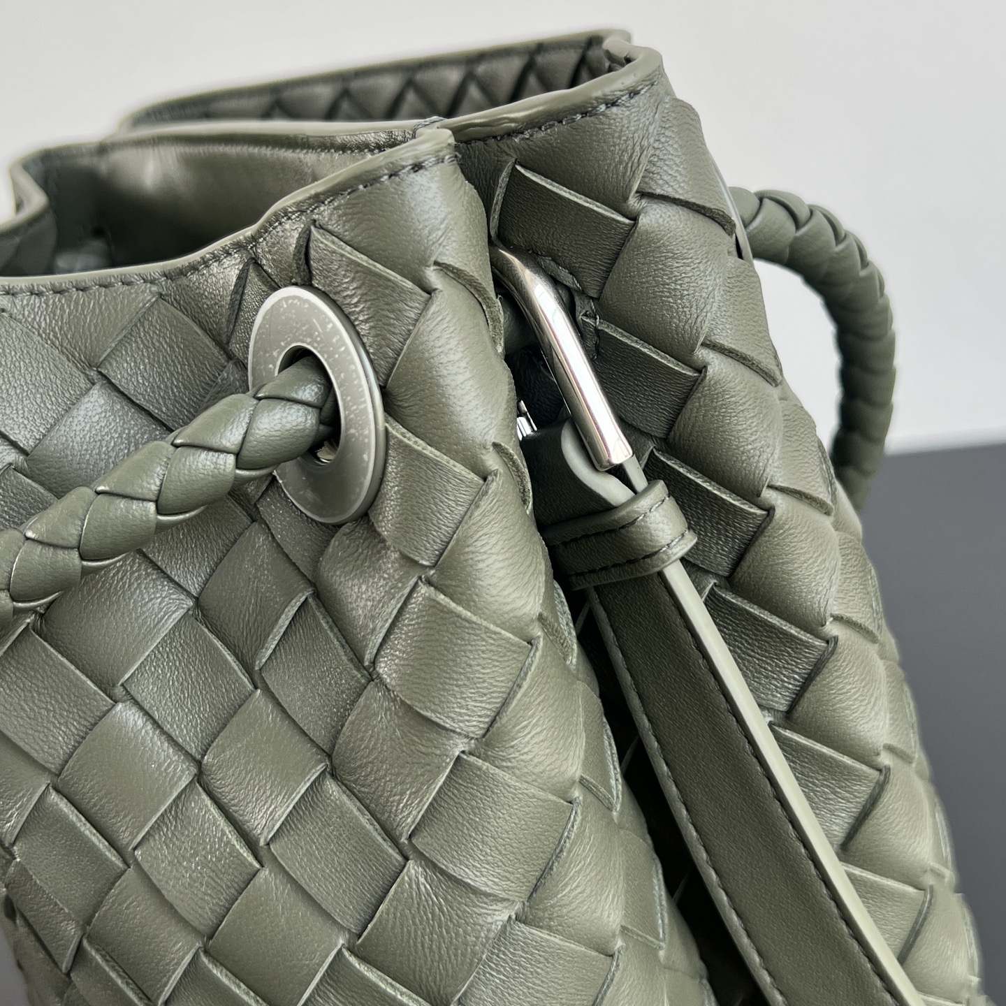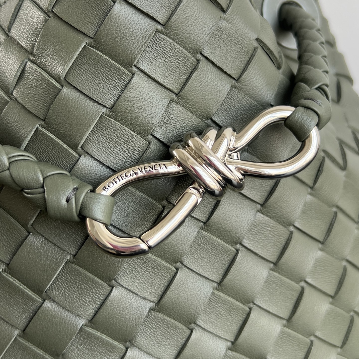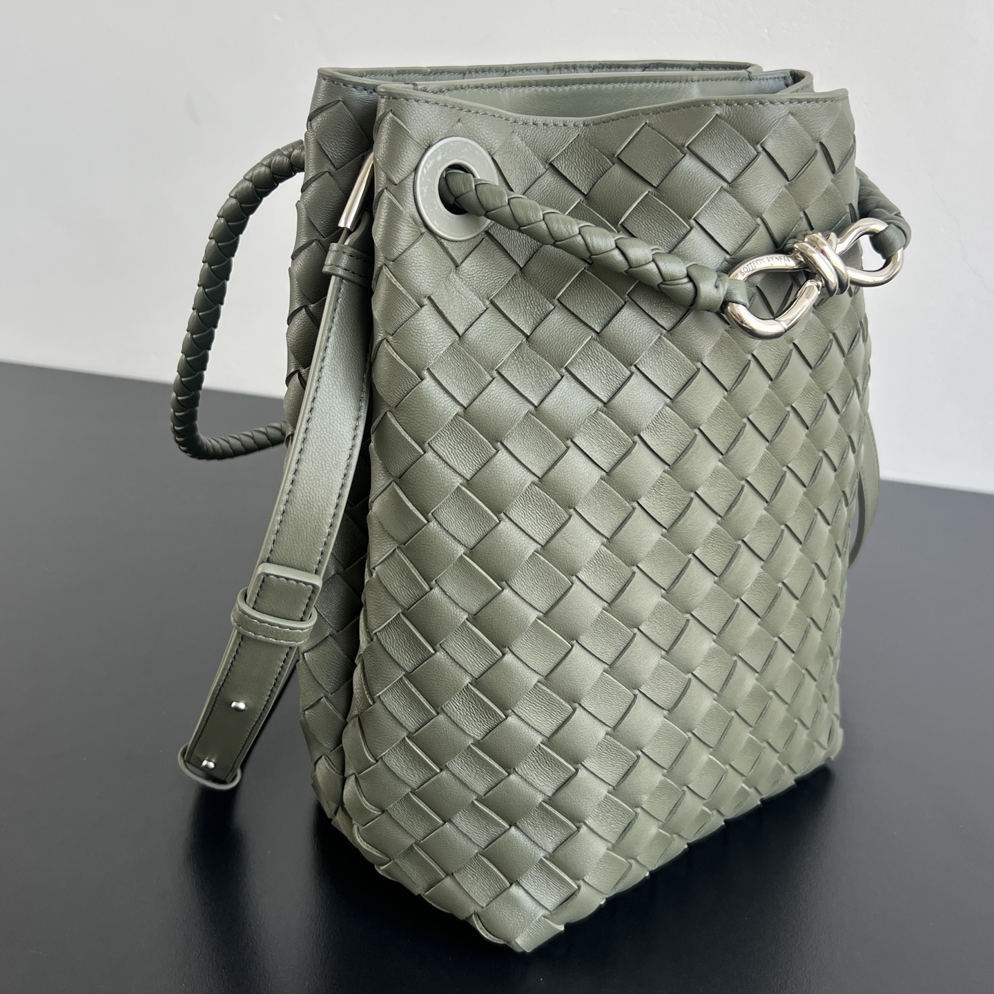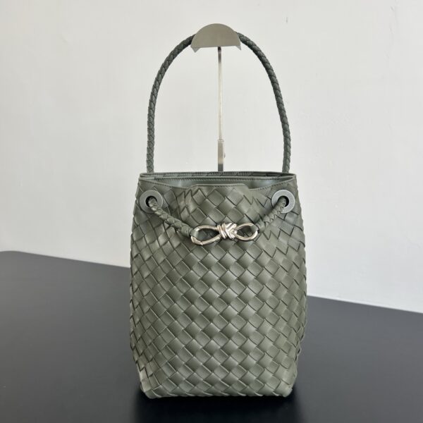 안디아모 버킷 백은 디자인과 실용성을 모두 갖춘 아이템입니다. 클래식한 엮음 디자인과 섬세한 끈 매듭 디테일이 돋보이며, 고급스러운 느낌을 줍니다.