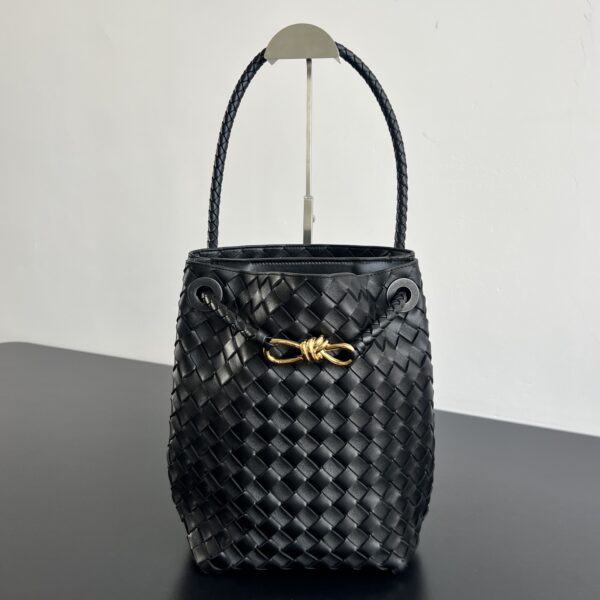 안디아모 버킷 백은 통근과 스타일을 모두 만족시키는 디자인으로, 클래식한 편직과 끈 매듭 디테일이 돋보입니다.