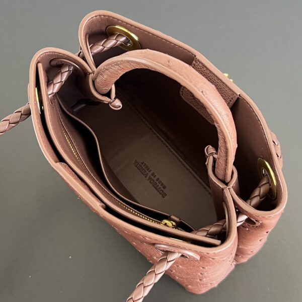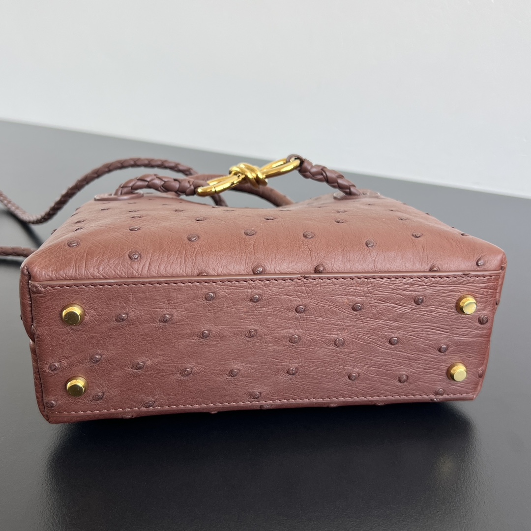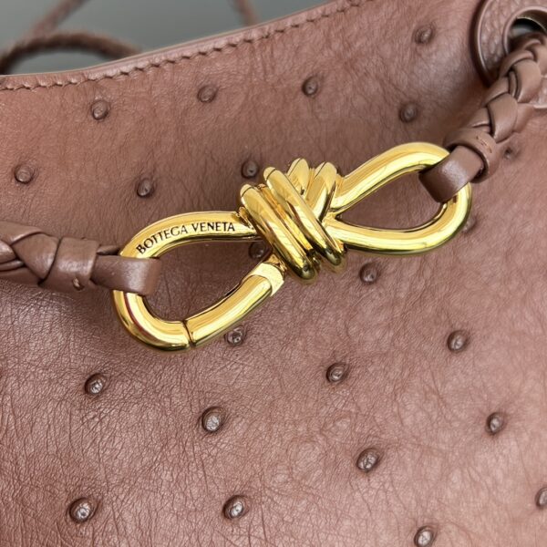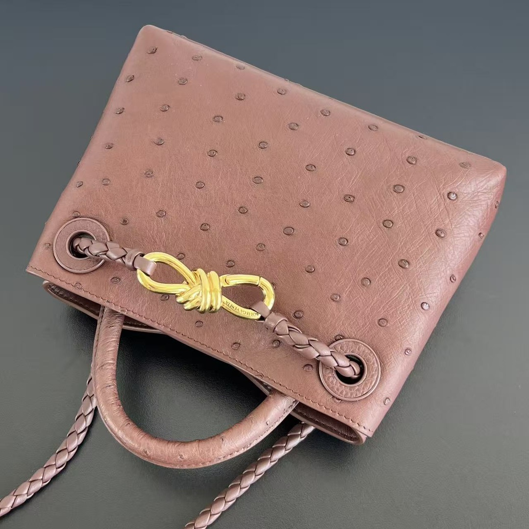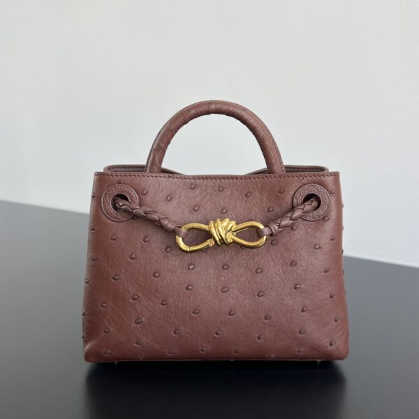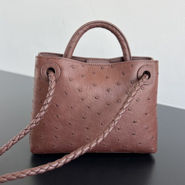 고급스러운 오스트리치 가죽으로 제작된 안디아모 미니백입니다. 독특한 펄 구멍이 있는 가죽 질감은 부드럽고 섬세한 느낌을 줍니다.