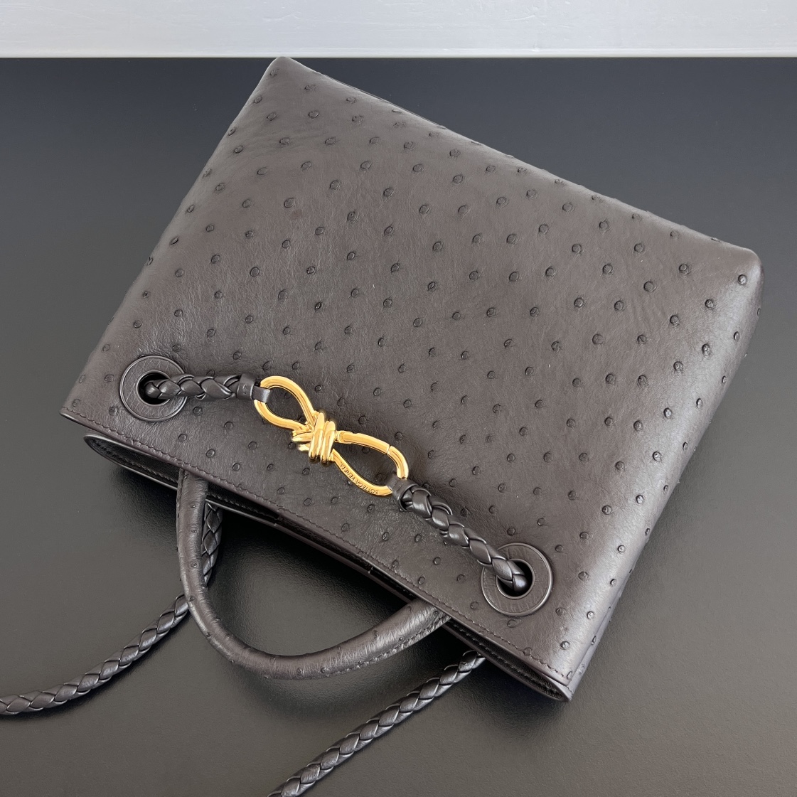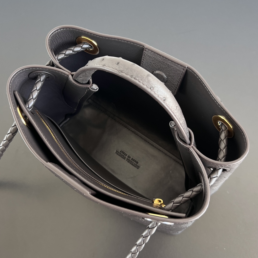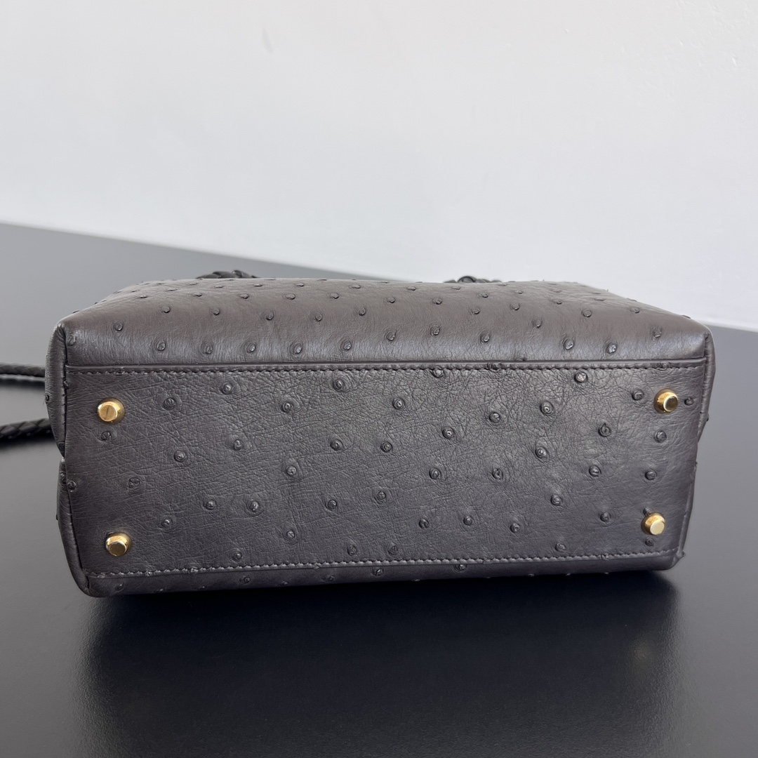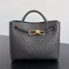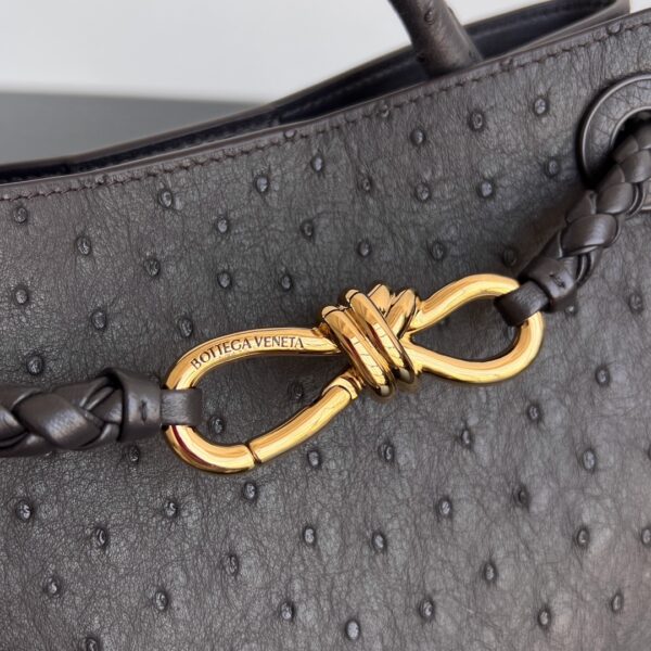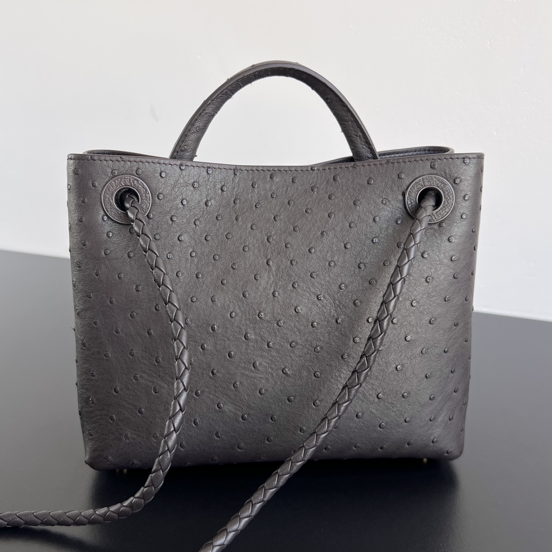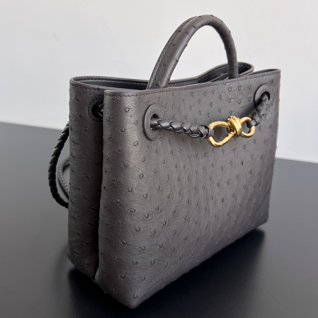 고급스러운 오스트리치 가죽으로 제작된 안디아모 백입니다. 독특한 펄 구멍이 있는 가죽 질감은 부드럽고 섬세하며, 손에 닿는 느낌이 특별합니다.