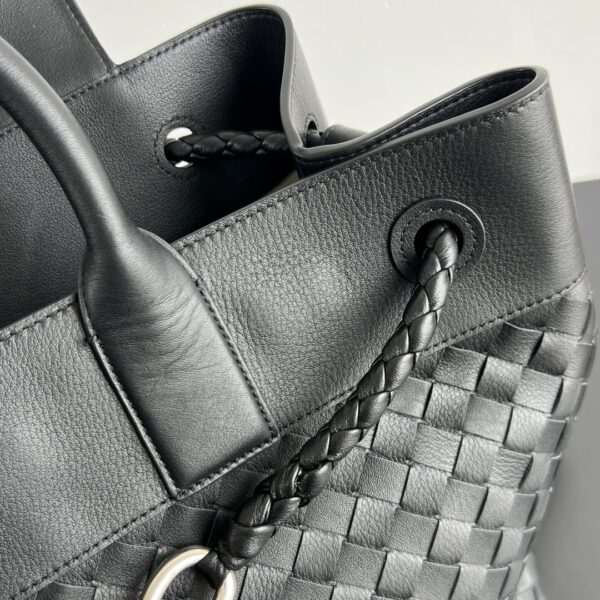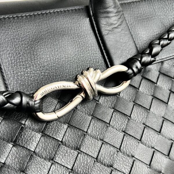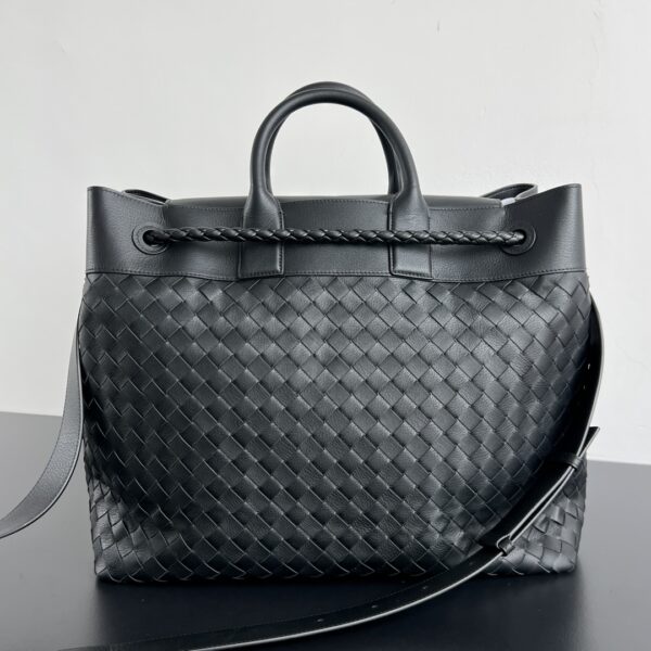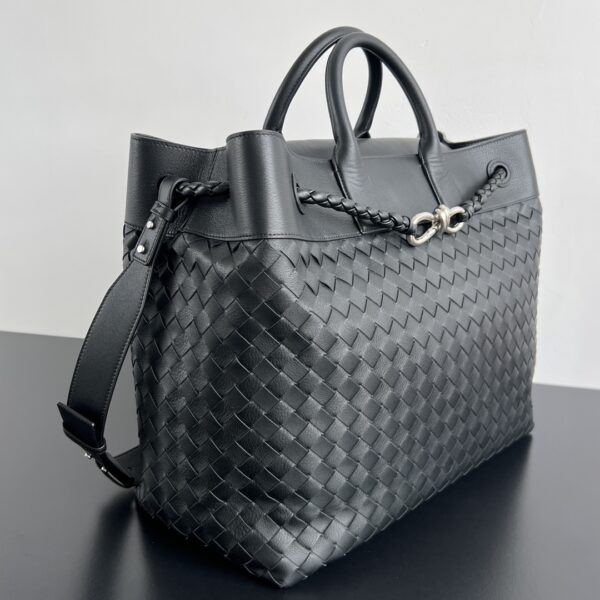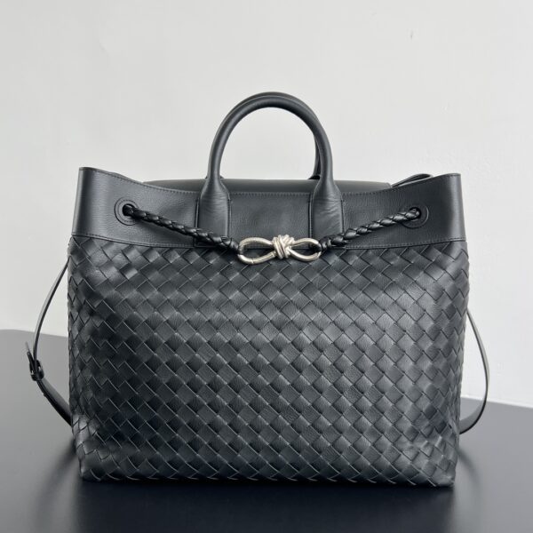 부드러운 소가죽과 엮인 가죽의 조화로 고급스러운 질감을 자랑하는 안디아모 중성 스타일 토트백입니다.