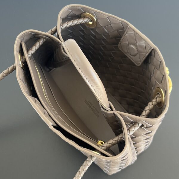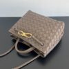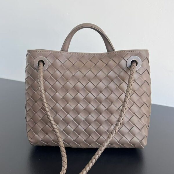 부드러운 나파 양가죽으로 제작된 보테가의 안디아모 토트백입니다. 전체적으로 클래식한 가죽 엮음 디자인이 돋보이며, 금색의 슬라이딩 메탈 끈으로 조절 가능한 어깨끈이 특징입니다.