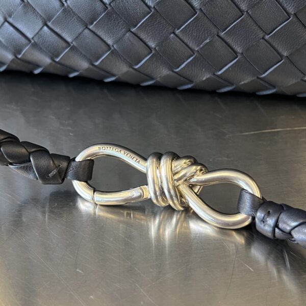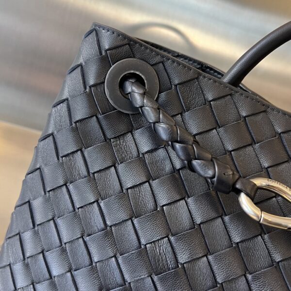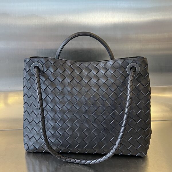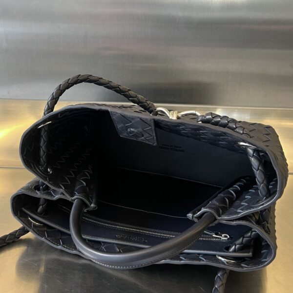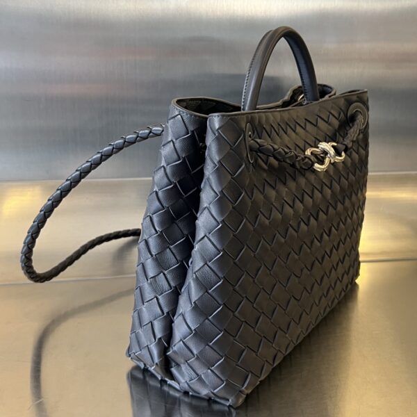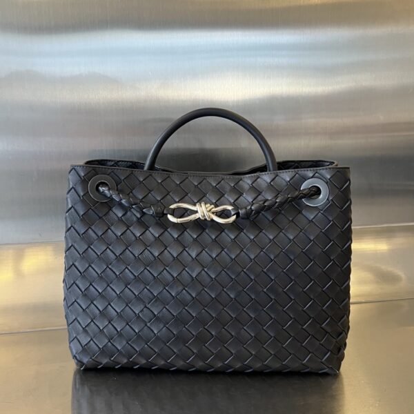 부드러운 나파 양가죽으로 제작된 안디아모 토트백입니다. 전체적으로 클래식한 가죽 엮음 디자인이 돋보이며, 금색의 슬라이딩 메탈 끈으로 어깨끈 길이를 조절할 수 있어 다양한 착용 방식이 가능합니다.