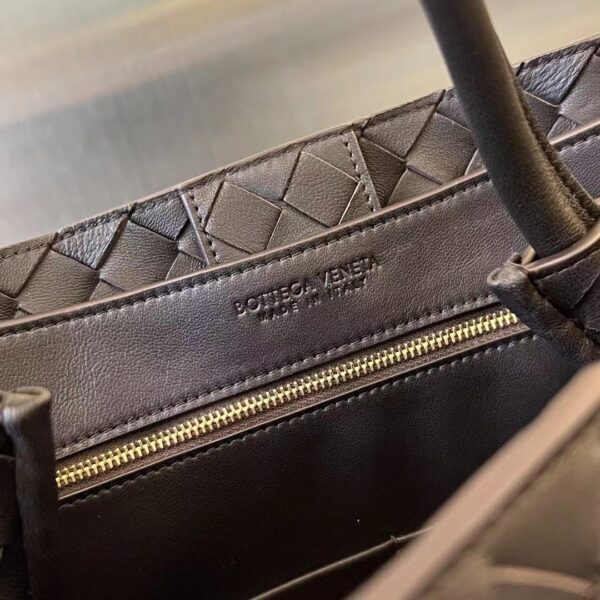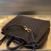 부드러운 나파 양가죽으로 제작된 안디아모 토트백입니다. 고급스러운 전체 가죽 편직 디자인과 금색의 매력적인 끈 조절 장식이 돋보입니다.