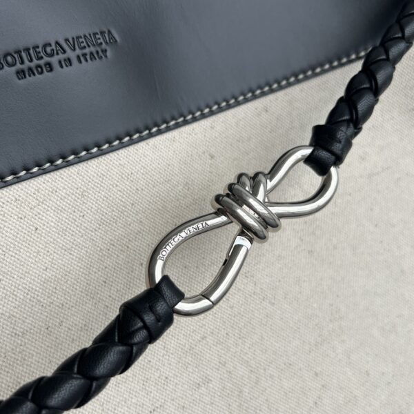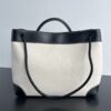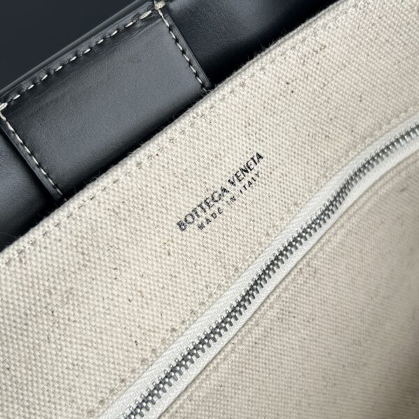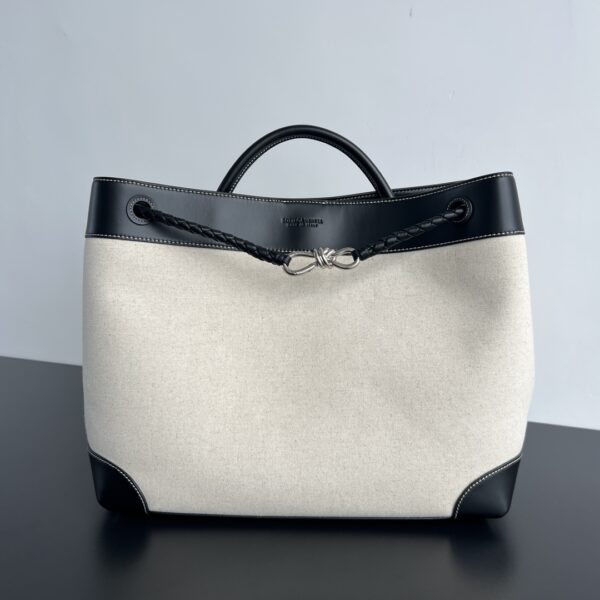 보테가의 안디아모 토트백은 소가죽과 캔버스의 조화로 이루어져 있습니다.