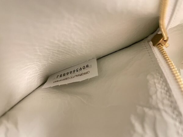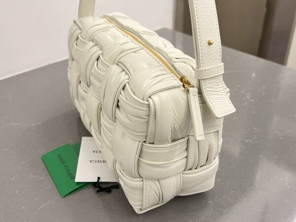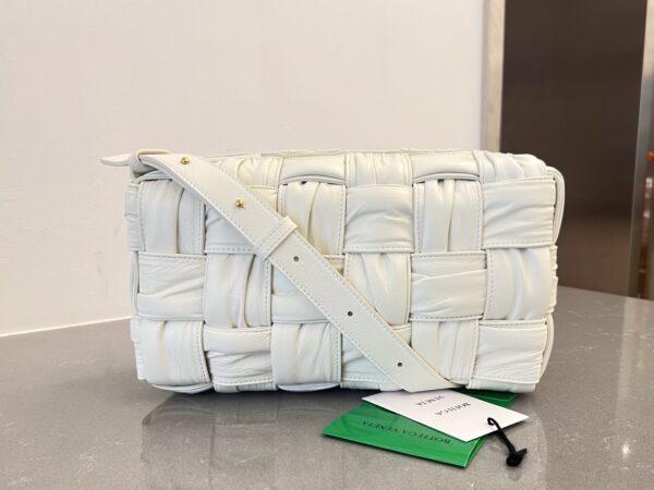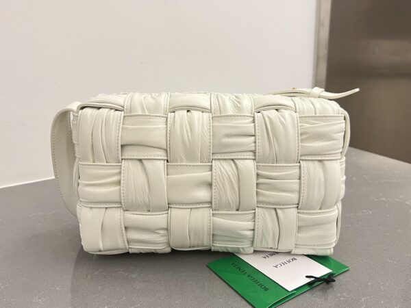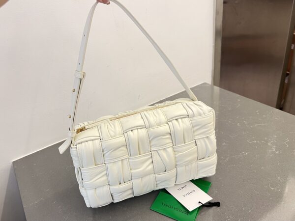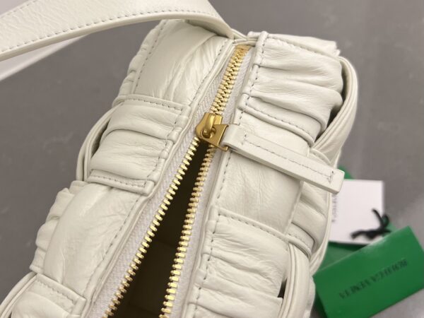 보테가의 새로운 디자인이 돋보이는 주름 가죽 숄더백입니다. 고급스러운 유광 소가죽과 부드러운 양가죽이 조화를 이루어, 세련된 느낌을 더해줍니다.