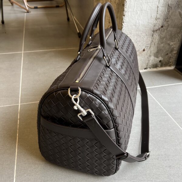 고급스러운 인트레치아토 디자인의 여행 가방입니다. 부드러운 소가죽으로 제작되어 뛰어난 내구성과 유연성을 자랑합니다.