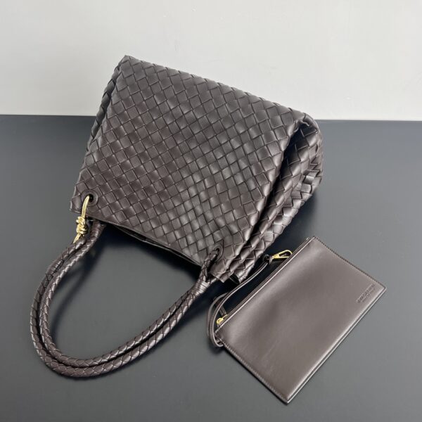 고급스러운 인트레치아토 패턴의 웨빙 가죽으로 제작된 숄더백입니다.